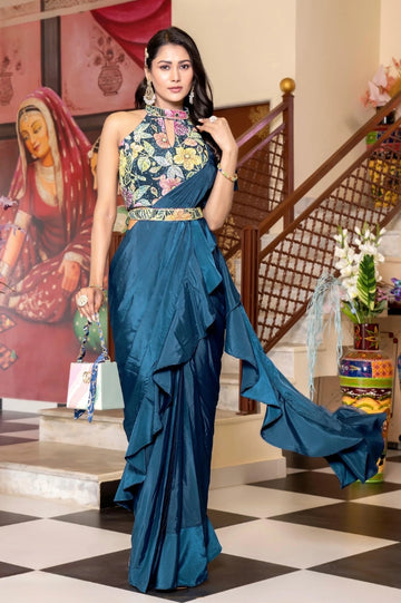 Radiate poise and sophistication with this Aqua Elegance A-Line Silk Kurta Set, crafted to bring...