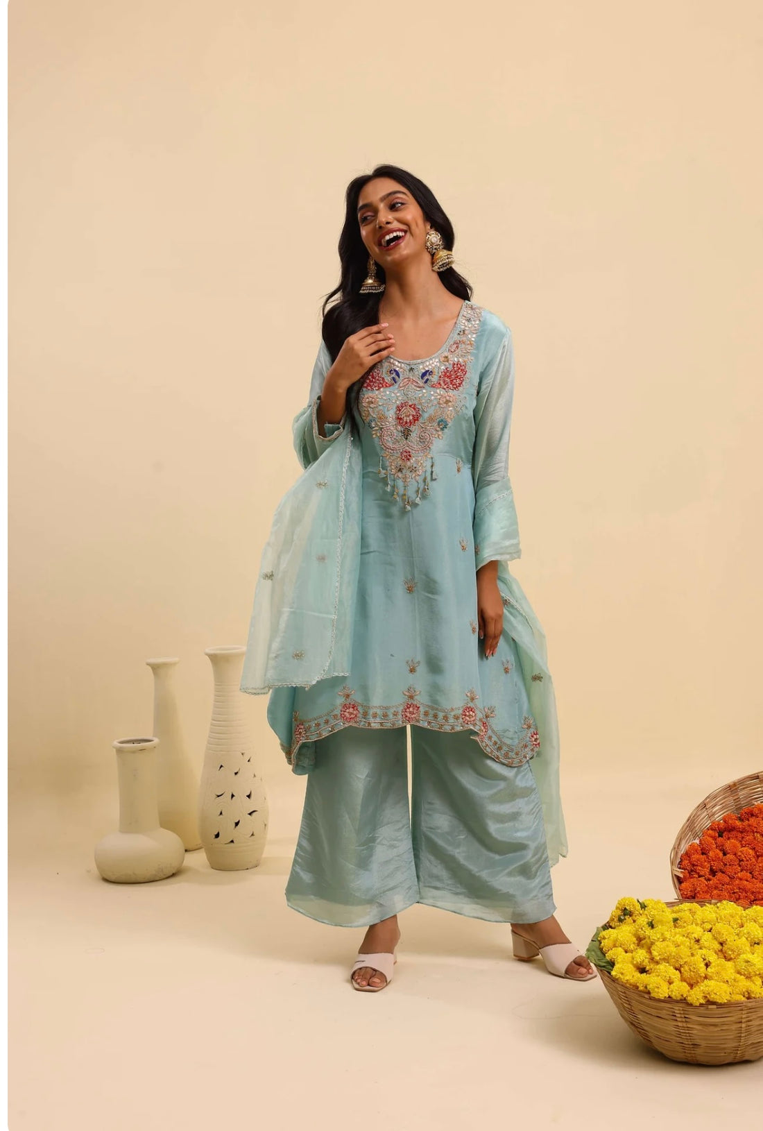 Radiate poise and sophistication with this Aqua Elegance A-Line Silk Kurta Set, crafted to bring...