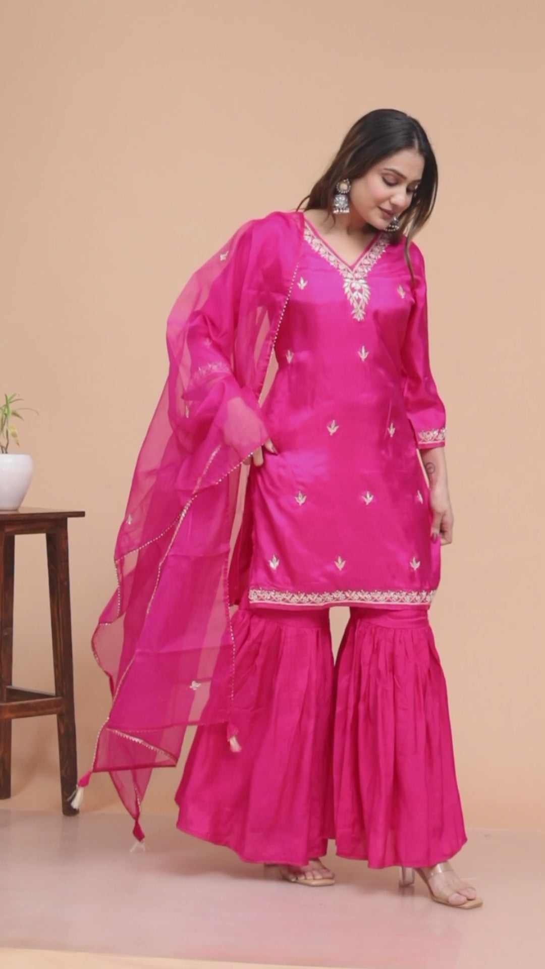 Fuchsia Blossom Dola Silk Hand-Embroidered Sharara Set