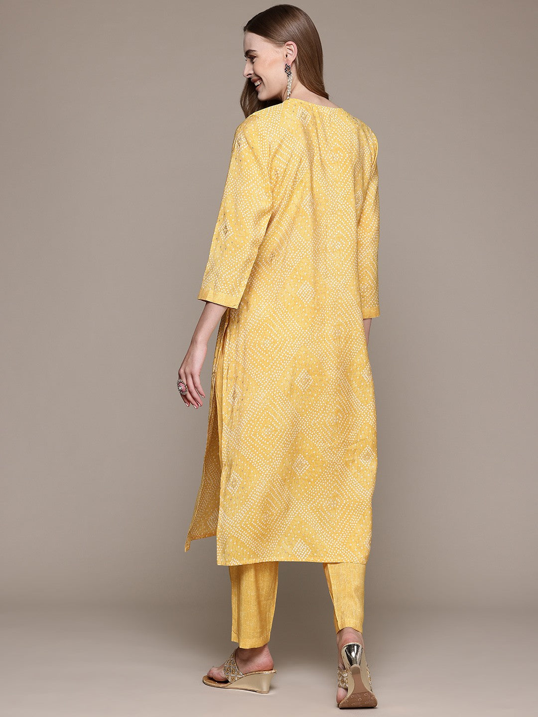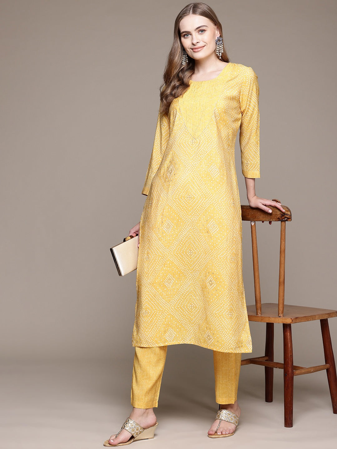 This straight-cut kurta features a classic round neckline and three-quarter sleeves, giving it a timeless silhouette. The intricate geometric bandhani-inspired print adds a touch of traditional charm while maintaining a modern vibe.