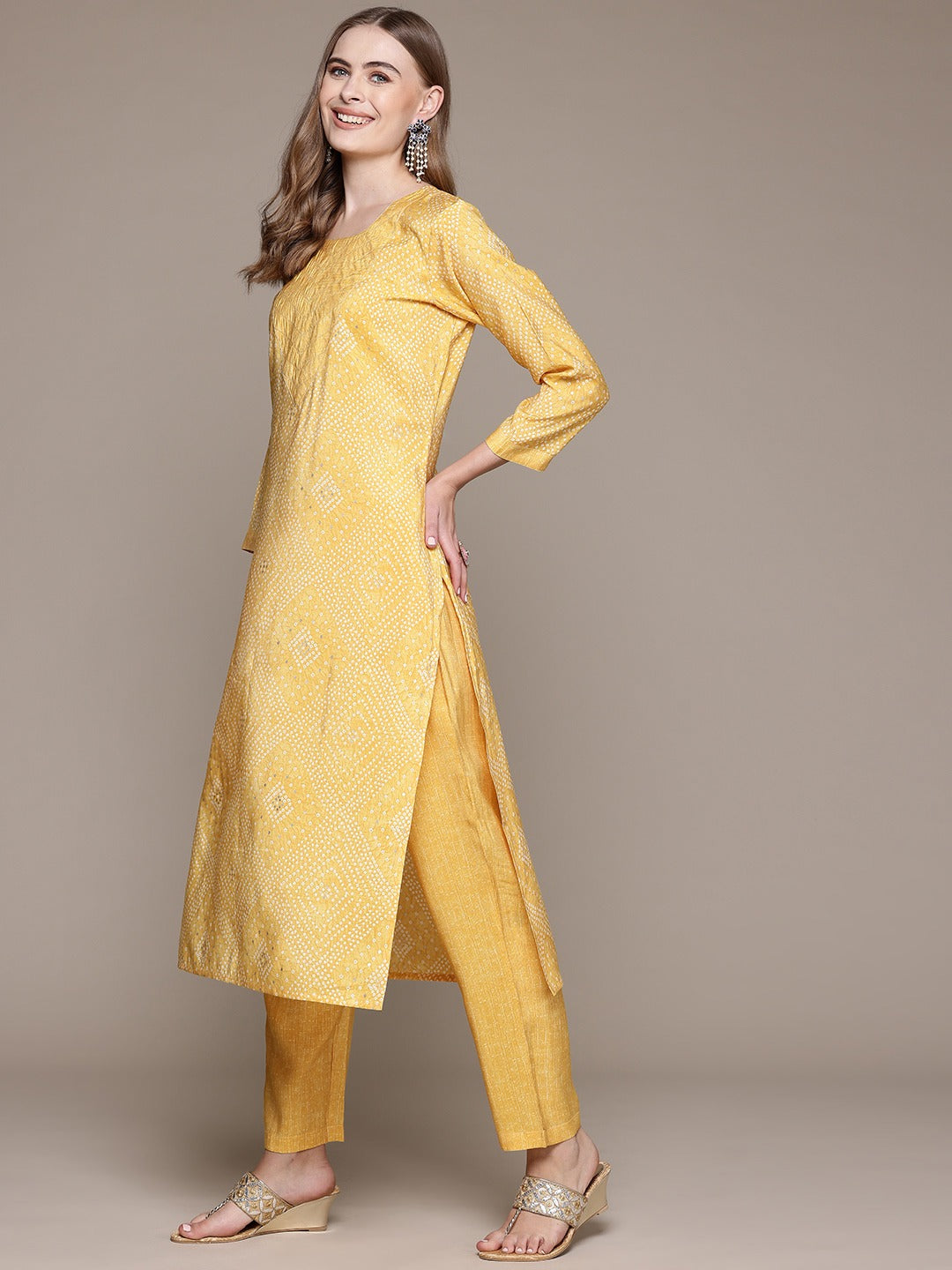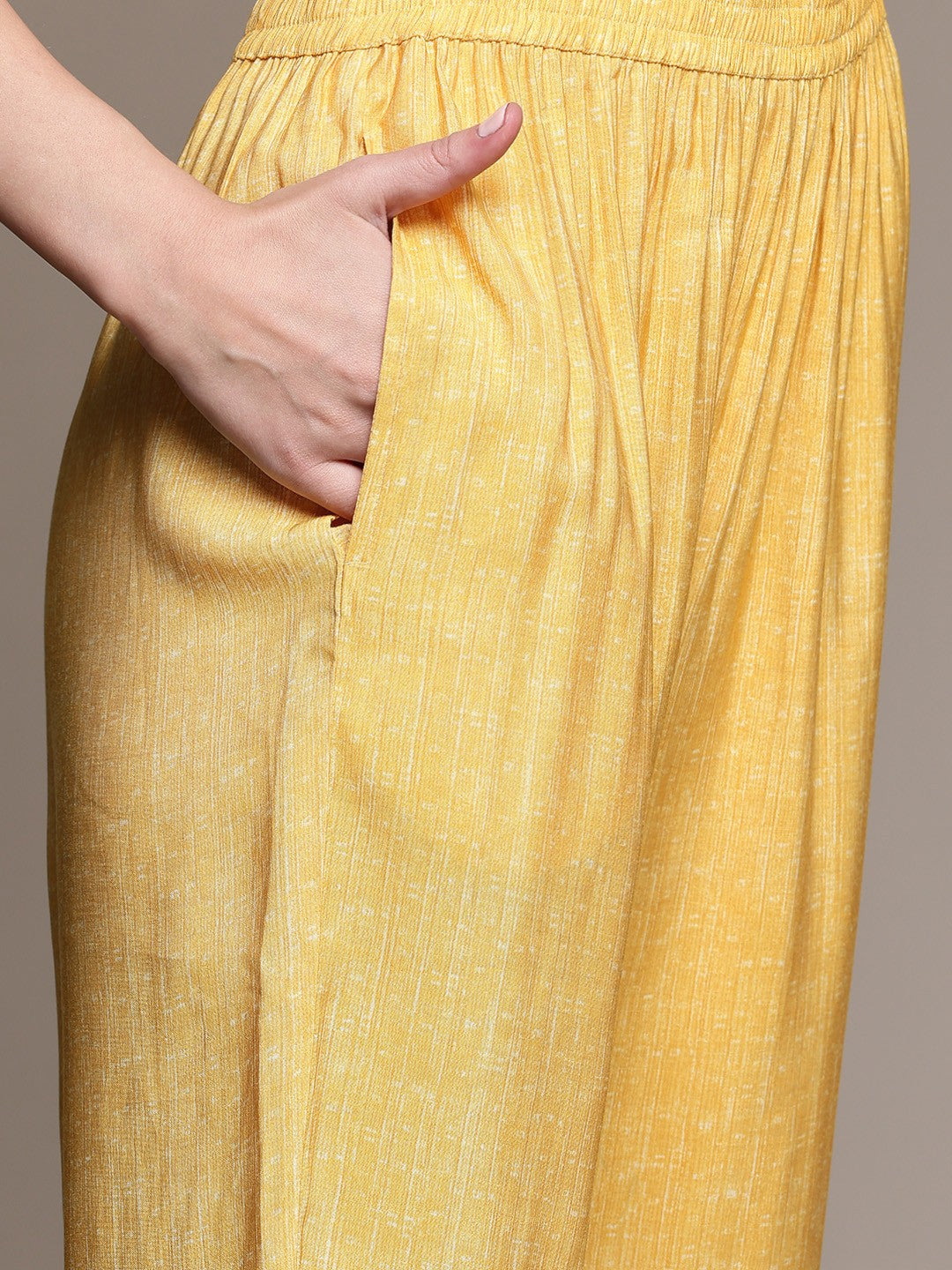 Rendered in a vibrant yellow hue, this outfit radiates positivity and warmth — a perfect choice for festive occasions or daytime celebrations. The delicate all-over print enhances its ethnic appeal, making it a wardrobe must-have.