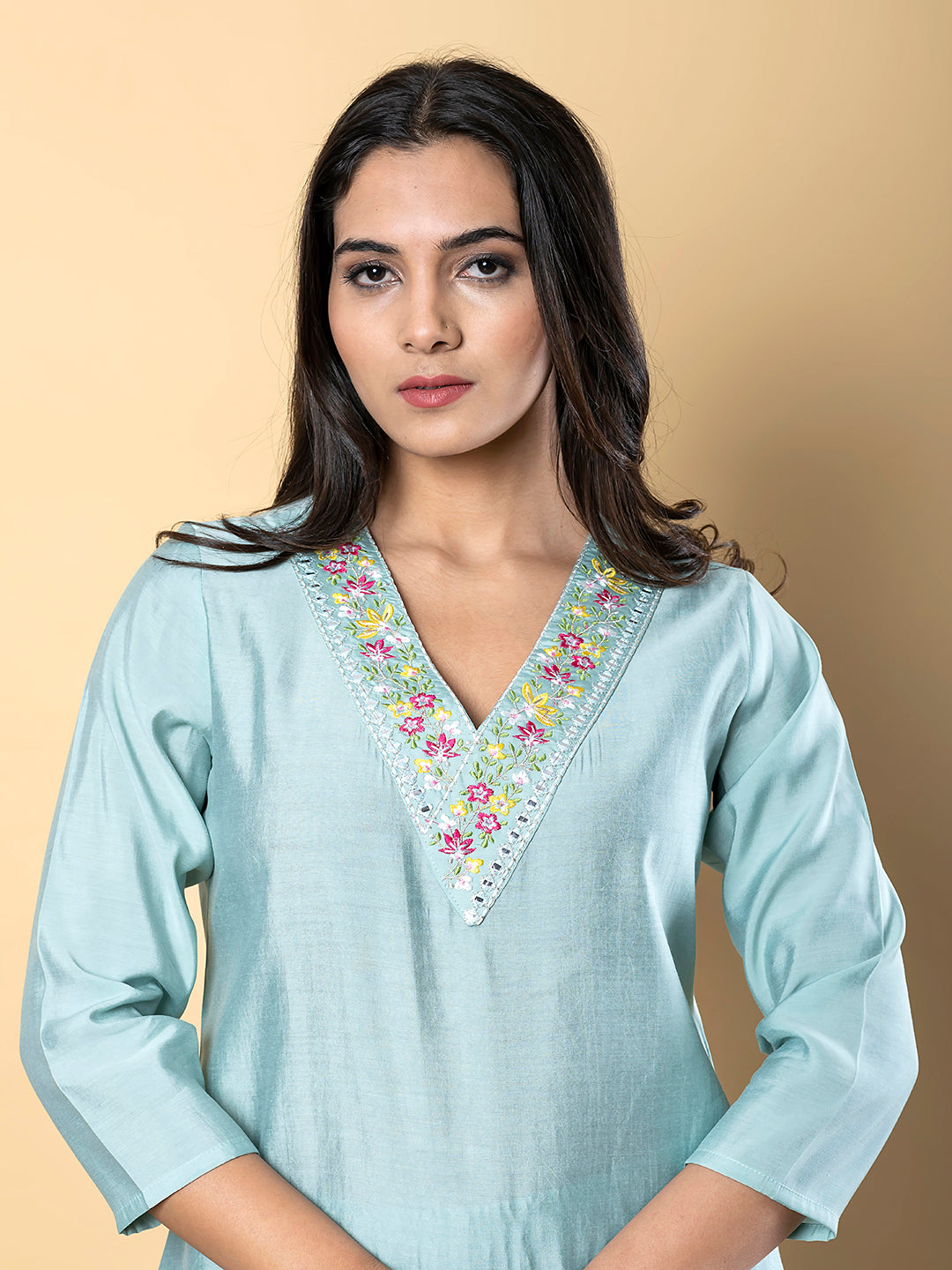 This straight-cut kurta features a classic silhouette with three-quarter sleeves and a side-slit design for added ease and structure. The highlight is the intricately embroidered neckline, adorned with delicate threadwork that adds a touch of charm and femininity.