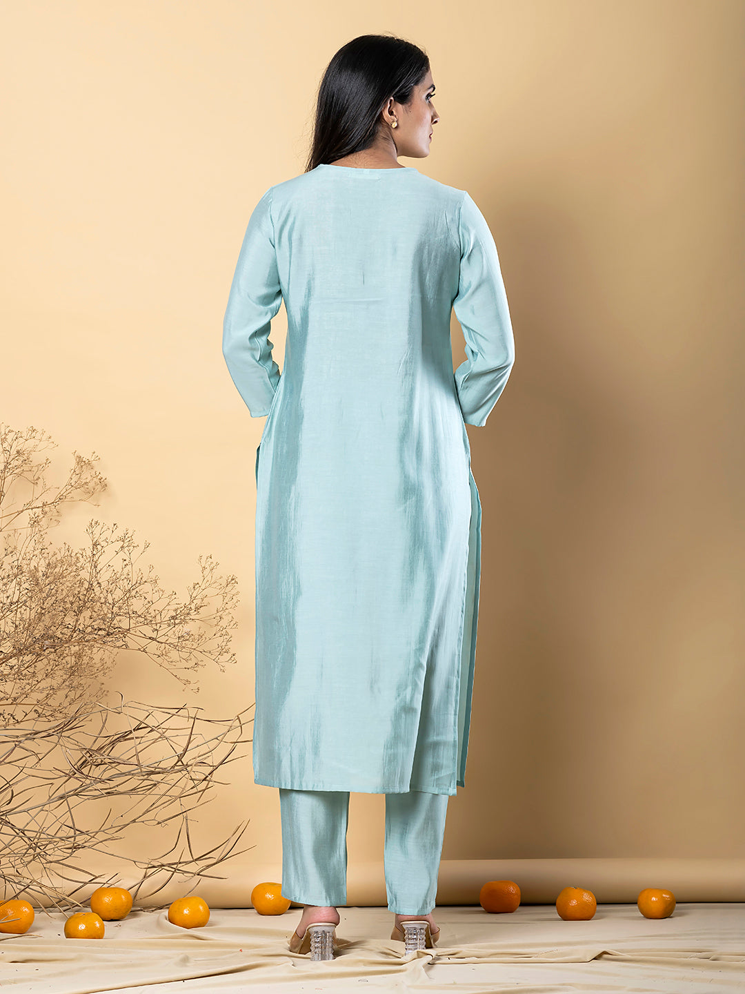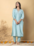Drenched in a soothing aqua shade, this outfit exudes calm sophistication. The floral embroidered yoke enhances its subtle appeal, creating a graceful balance between modern minimalism and traditional aesthetics.