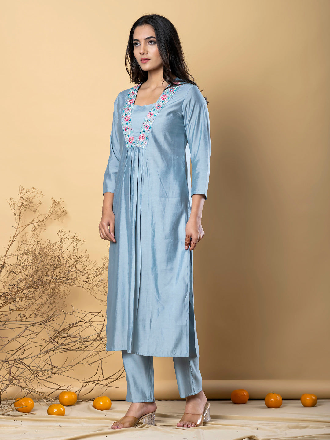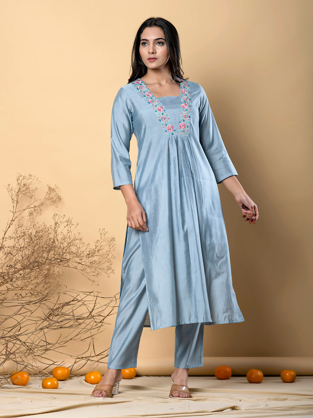 The soft powder blue hue exudes calm elegance, making it a versatile choice for both day and evening occasions. The contrast floral embroidery elevates the look with a pop of color and intricate detailing.