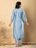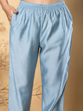 Add a touch of sophistication to your ethnic wardrobe with this elegant powder blue kurta set, crafted from luxurious Roman silk that drapes beautifully and offers a subtle sheen.