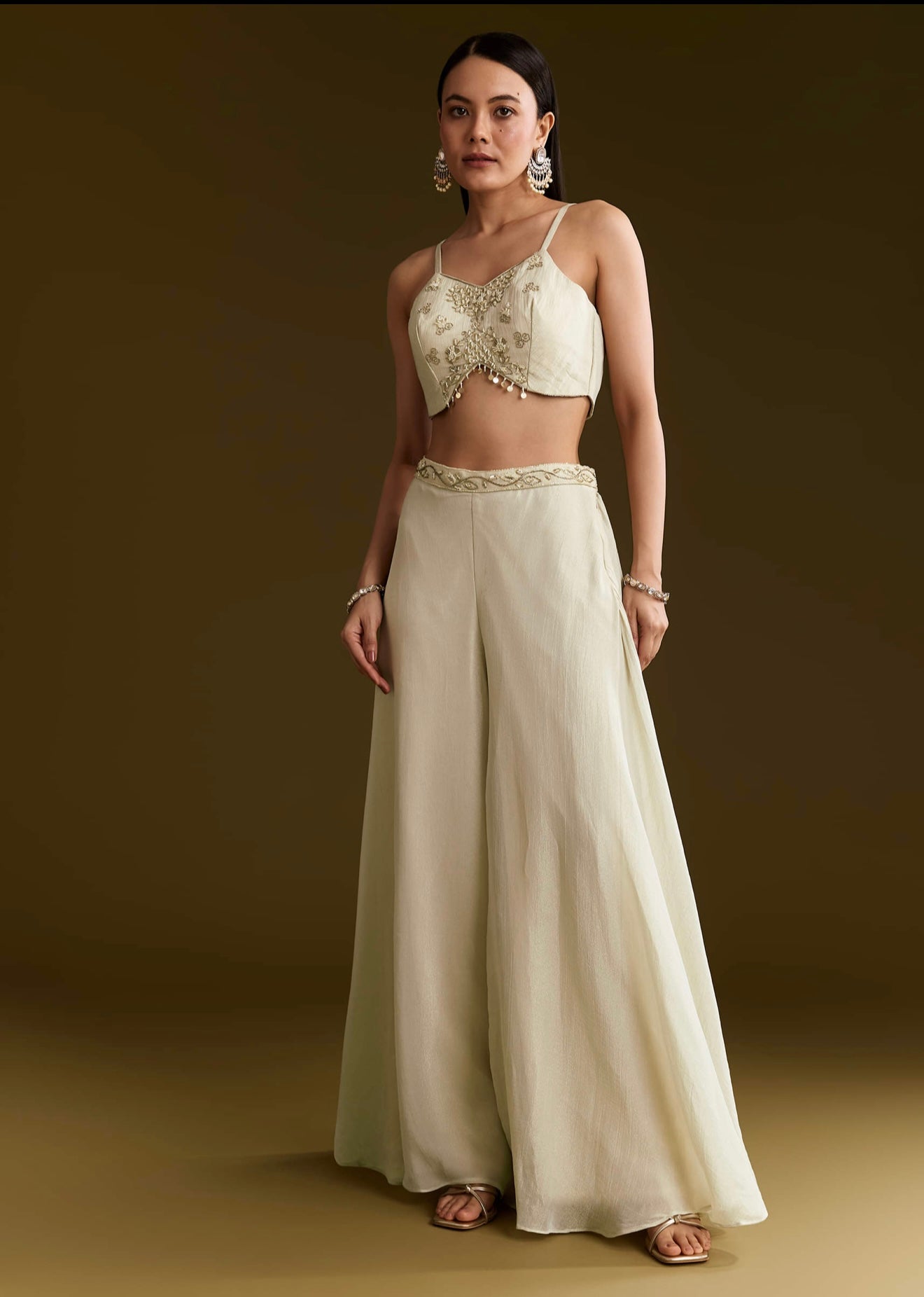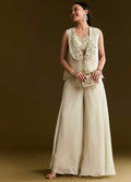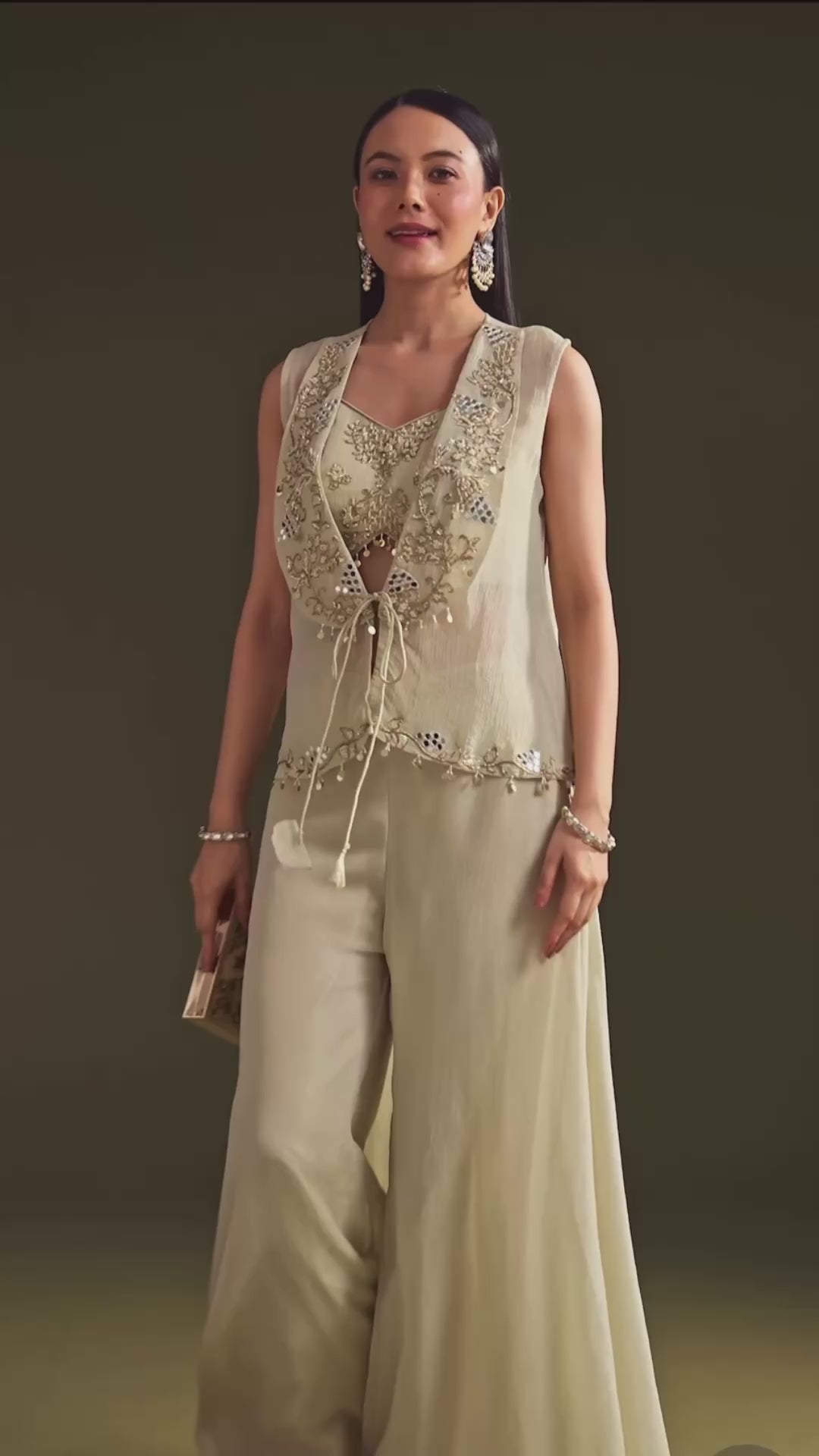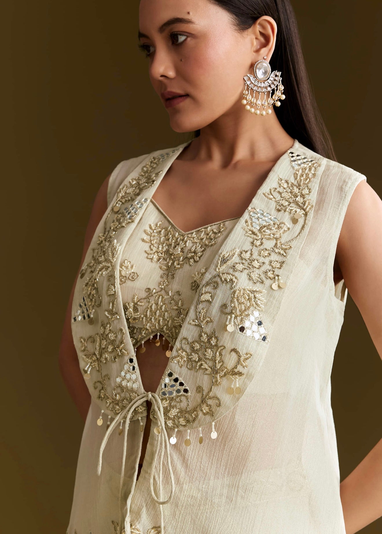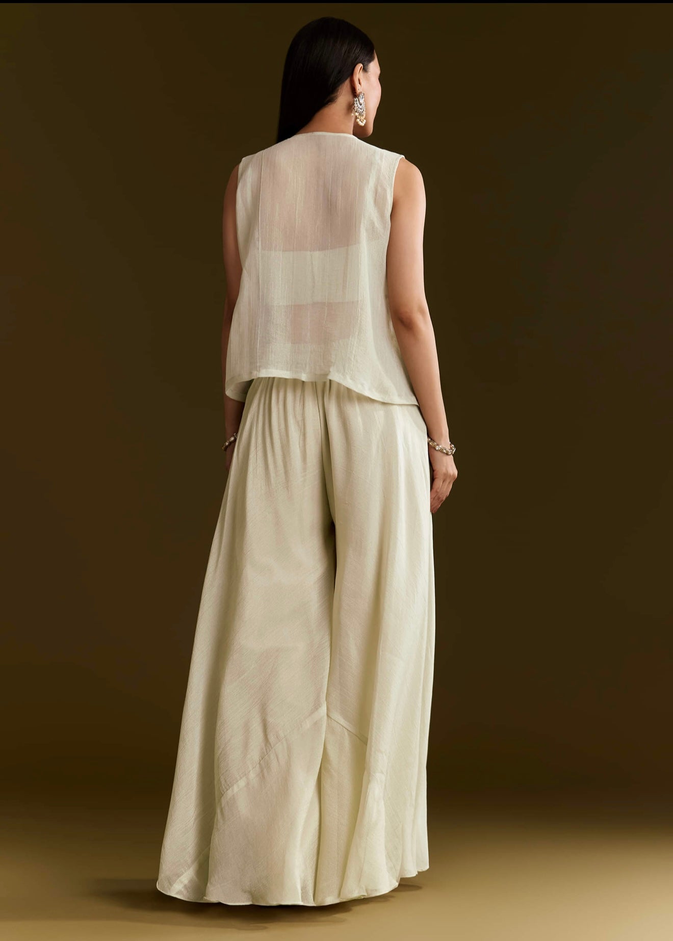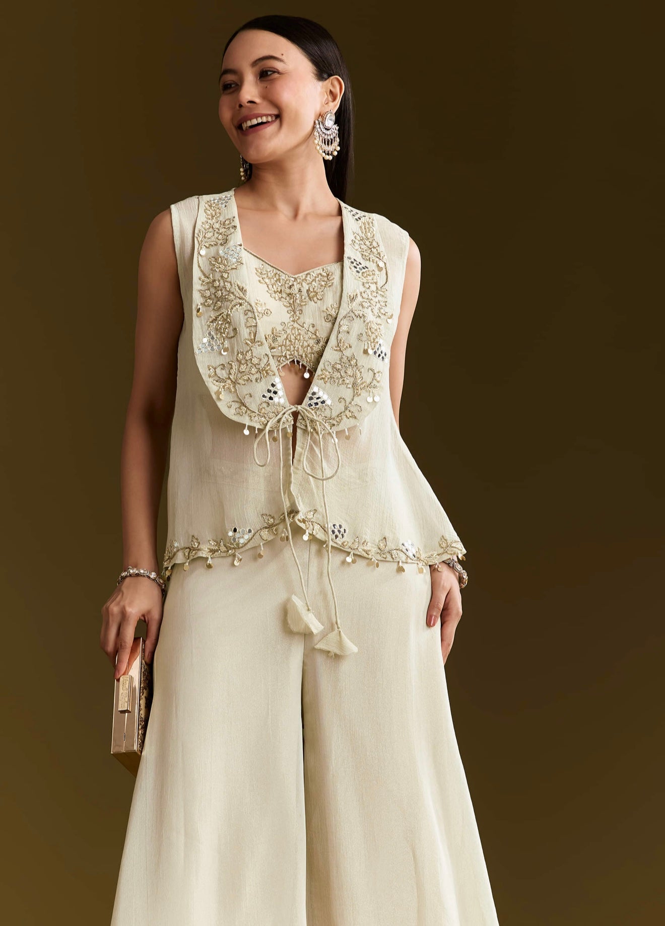 The set features a sleeveless tie-front overlay jacket and a delicately embroidered blouse, paired with wide-leg palazzo pants for a flattering, graceful silhouette. The intricate hand embroidery with mirror work and bead accents adds a touch of sparkle, while the soft ivory hue keeps it sophisticated and versatile—perfect for festive occasions, weddings, or evening soirées.