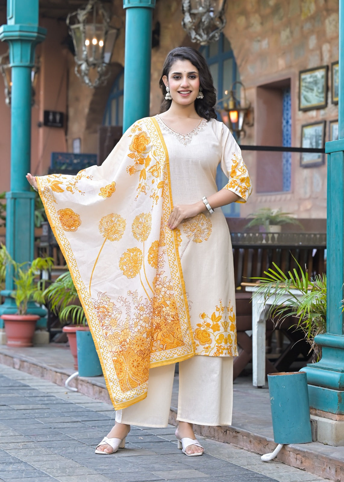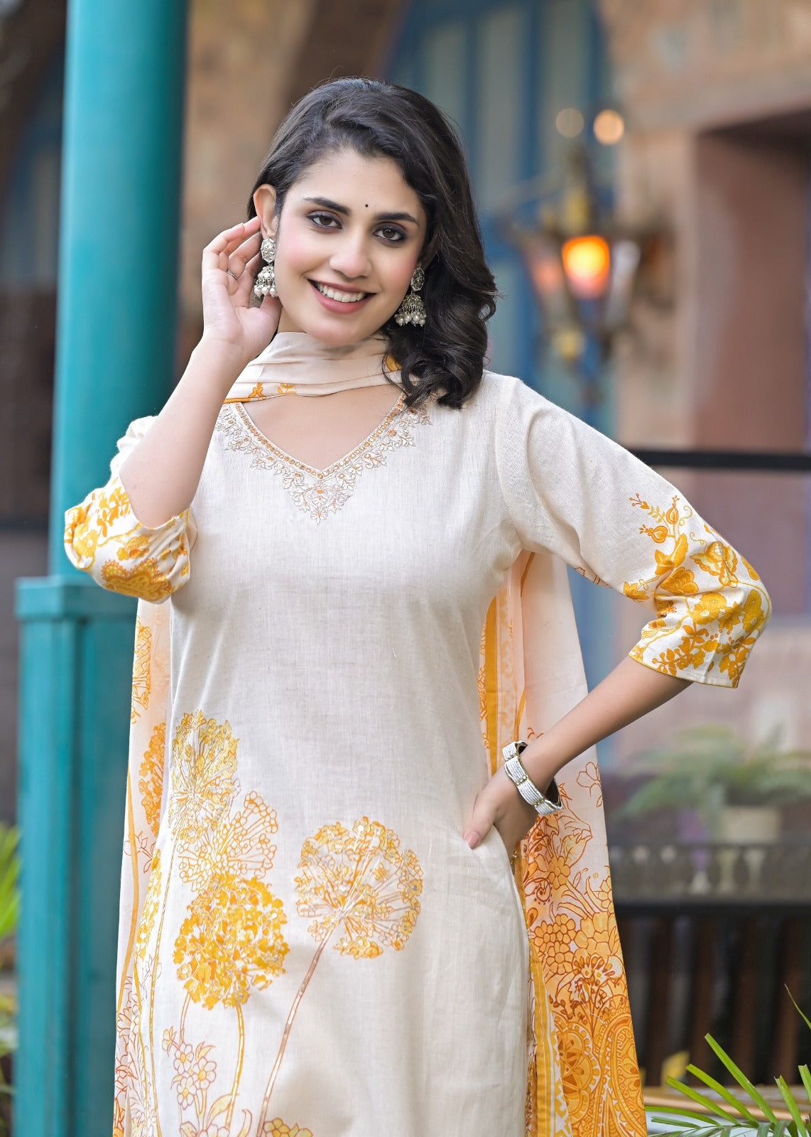 Dupatta: Lightweight cotton dupatta with intricate yellow floral patterns and a decorative border