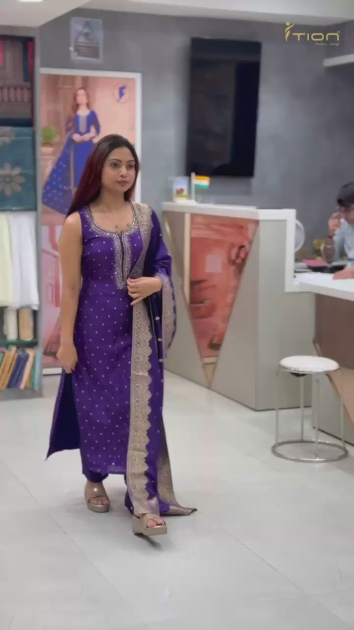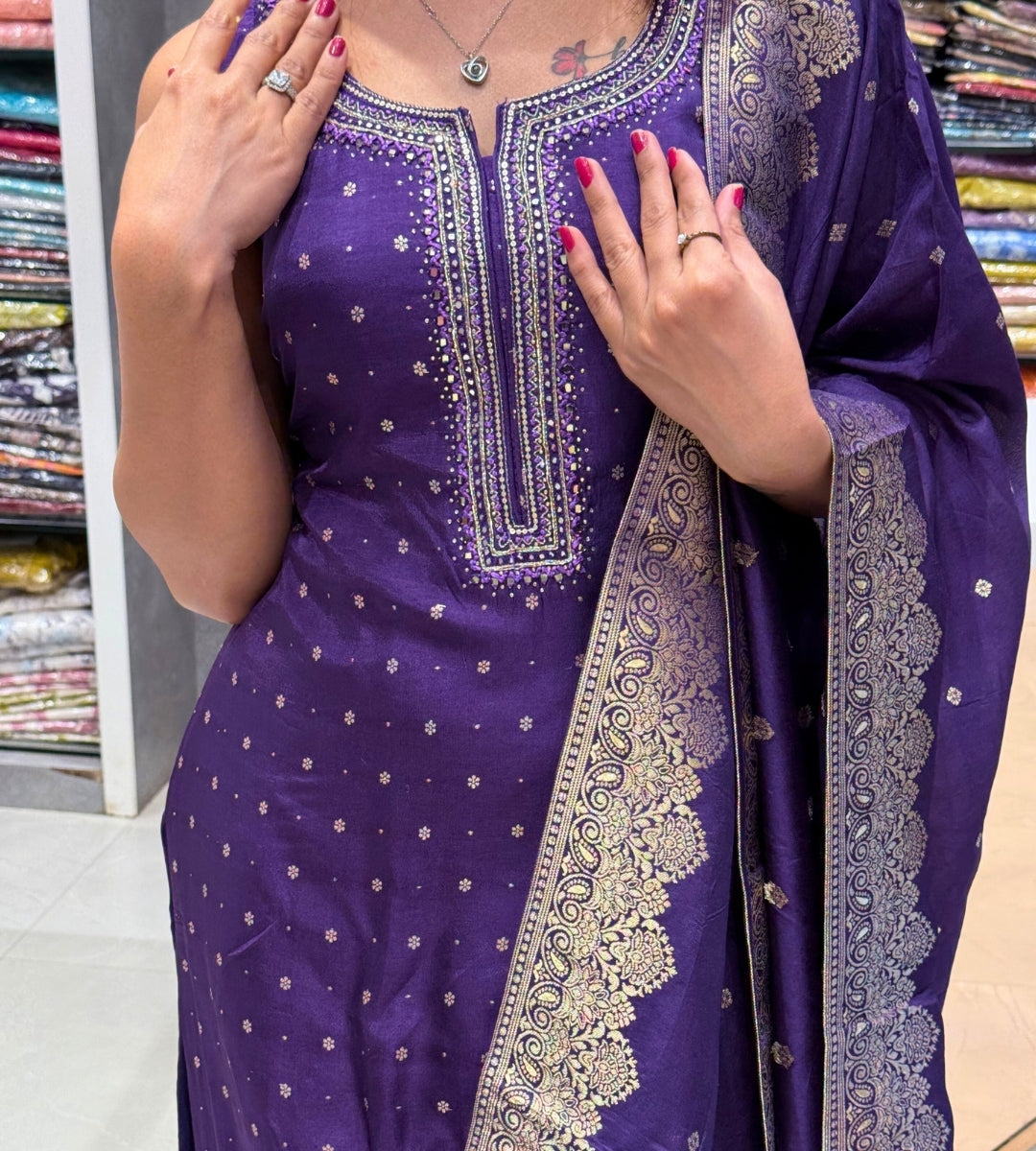 Step into timeless elegance with this stunning pure brocade silk suit set in a rich royal purple shade. The kurta features delicate woven motifs with intricate detailing on the neckline, paired with a beautifully designed dupatta with golden floral borders that exudes regal charm.