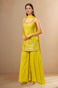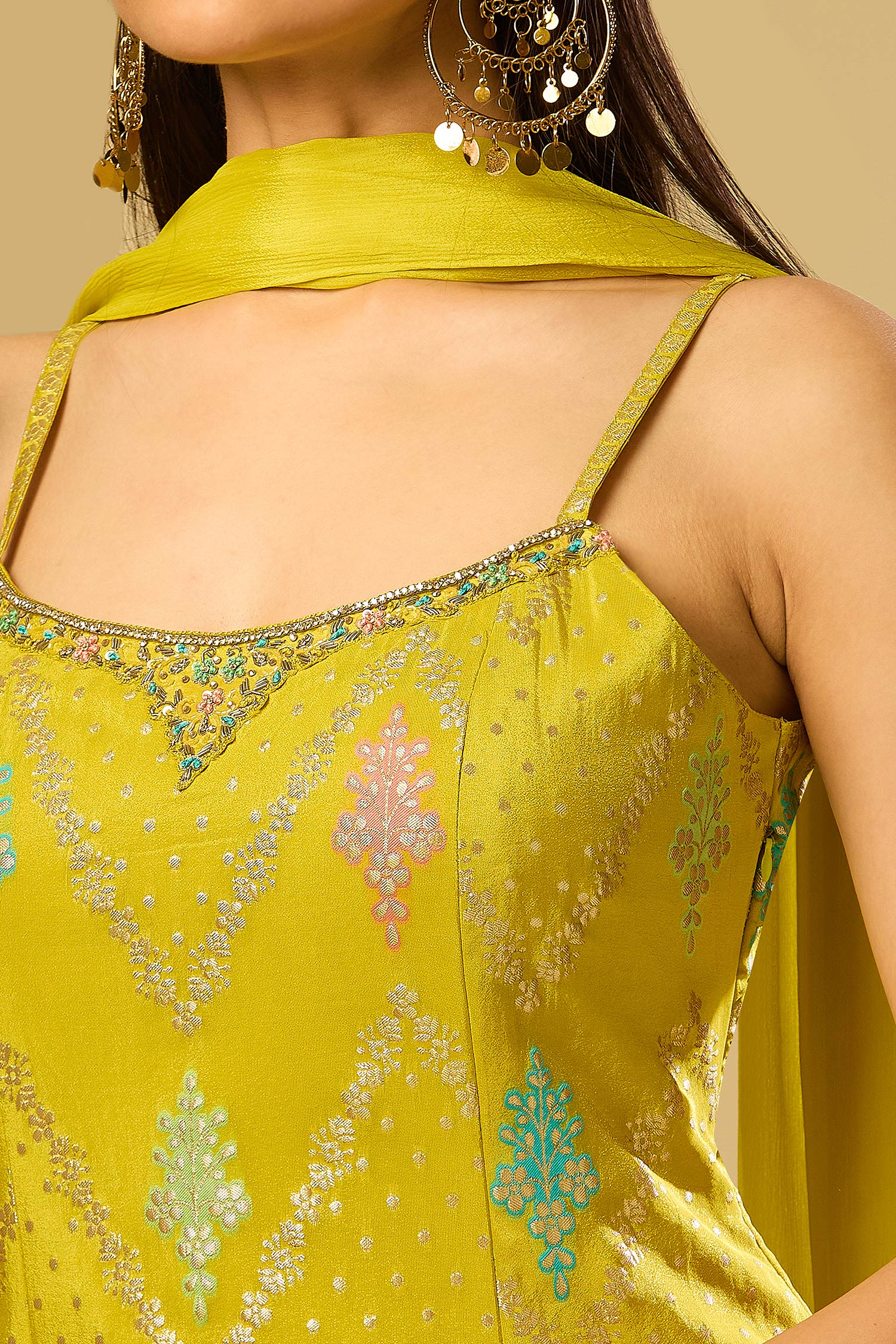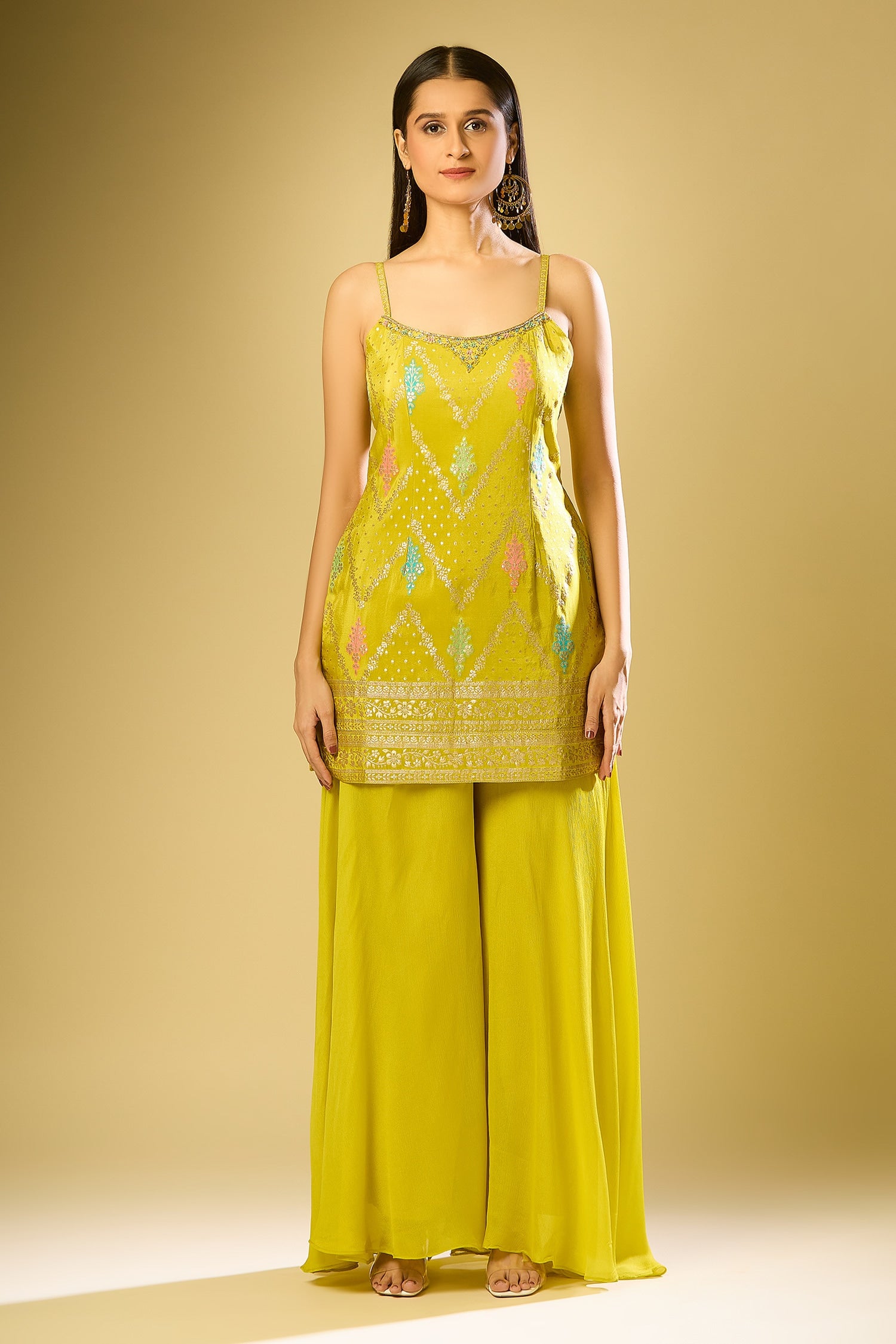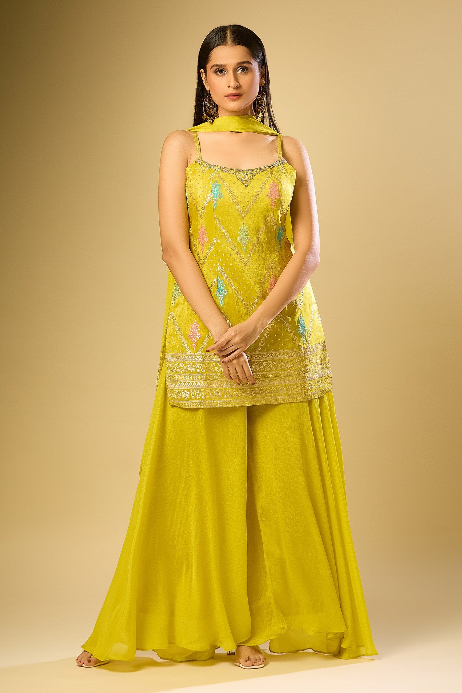 Radiate festive elegance with this stunning two-piece ensemble, crafted for comfort and luxury. The sleeveless kurti is made from premium brocade silk, adorned with intricate zari motifs and soft pastel accents for a vibrant yet sophisticated look. Paired with flowy palazzo pants in pure silk crepe, this outfit drapes beautifully, offering effortless grace with every step.