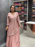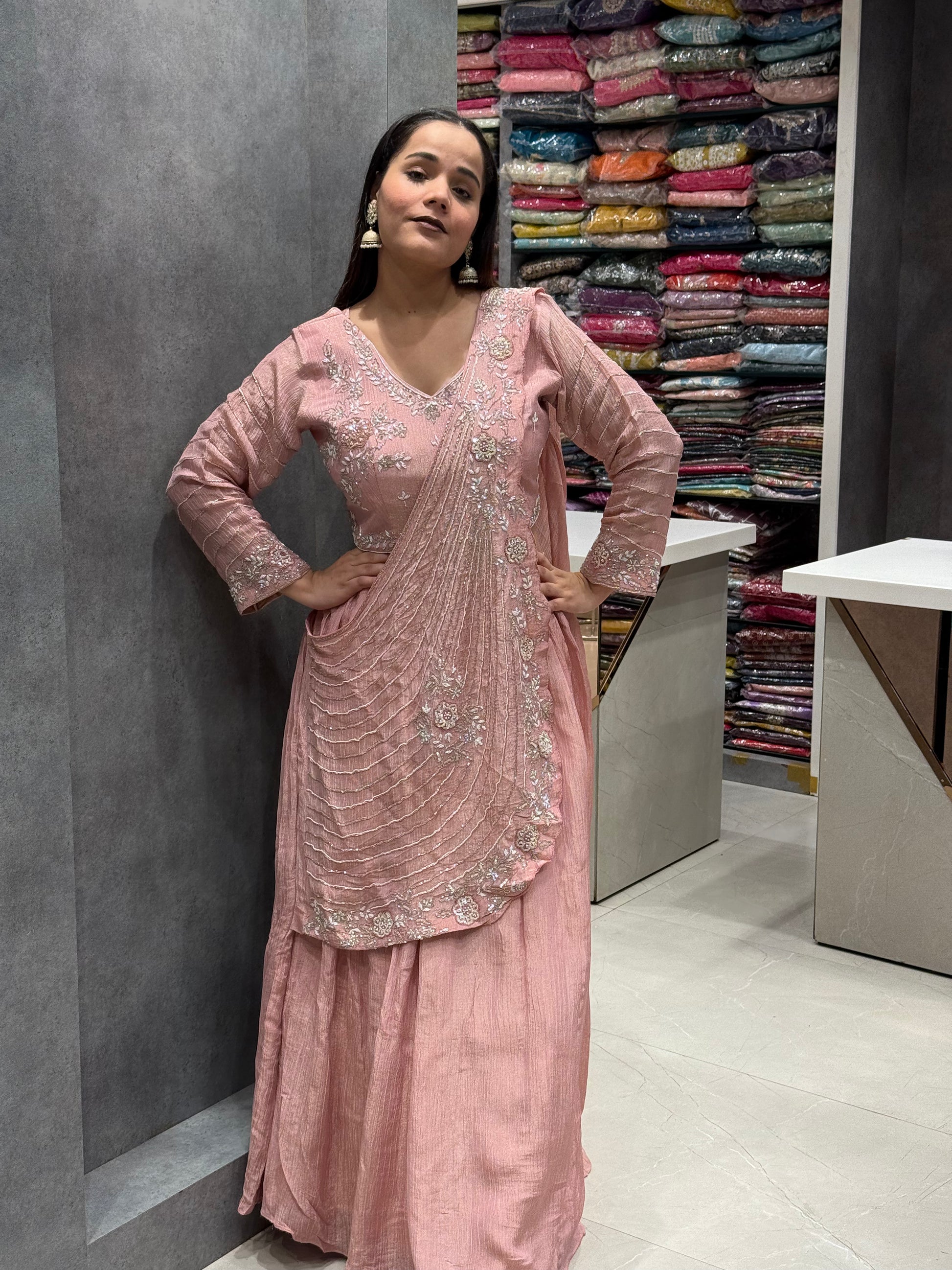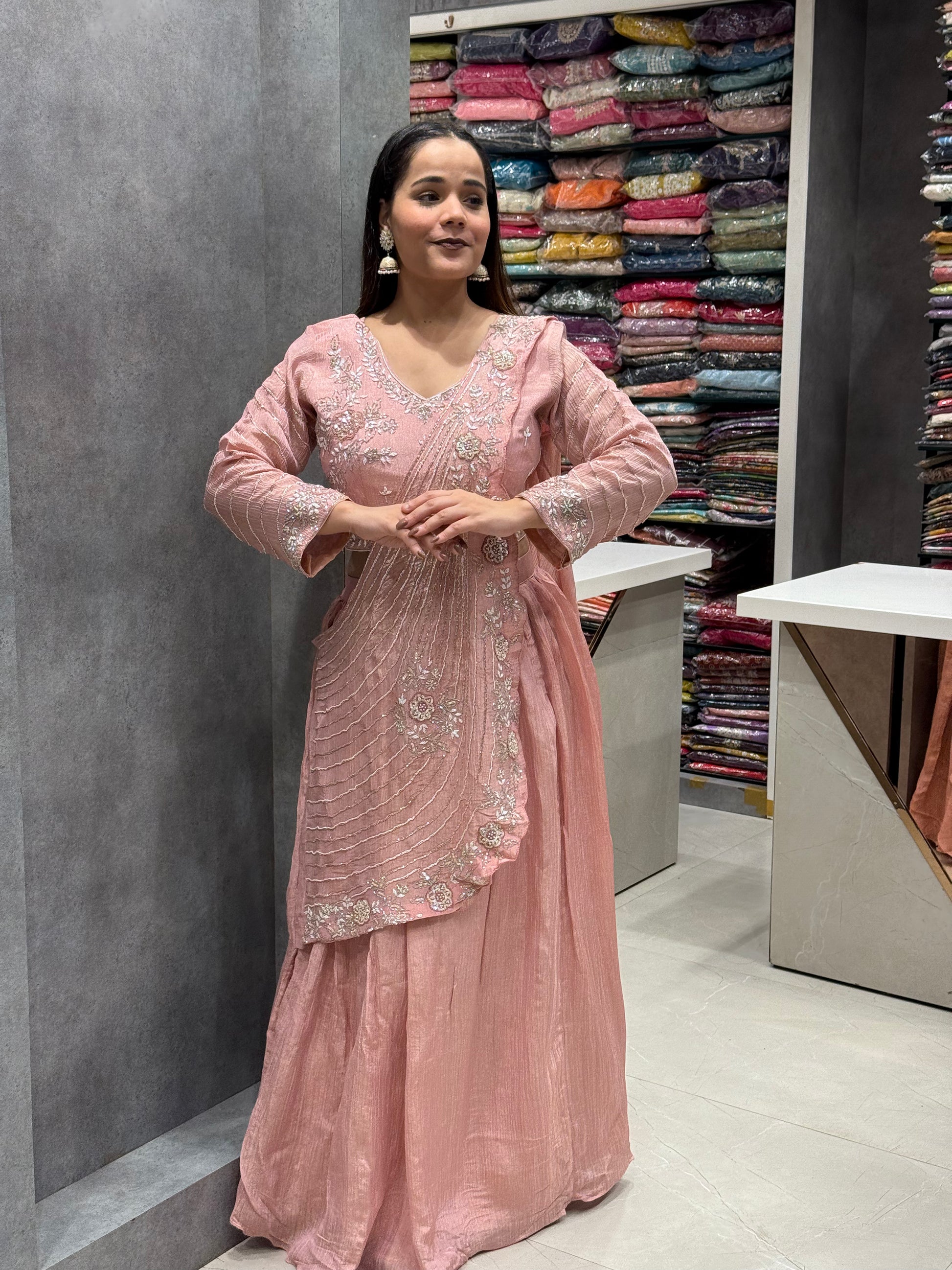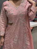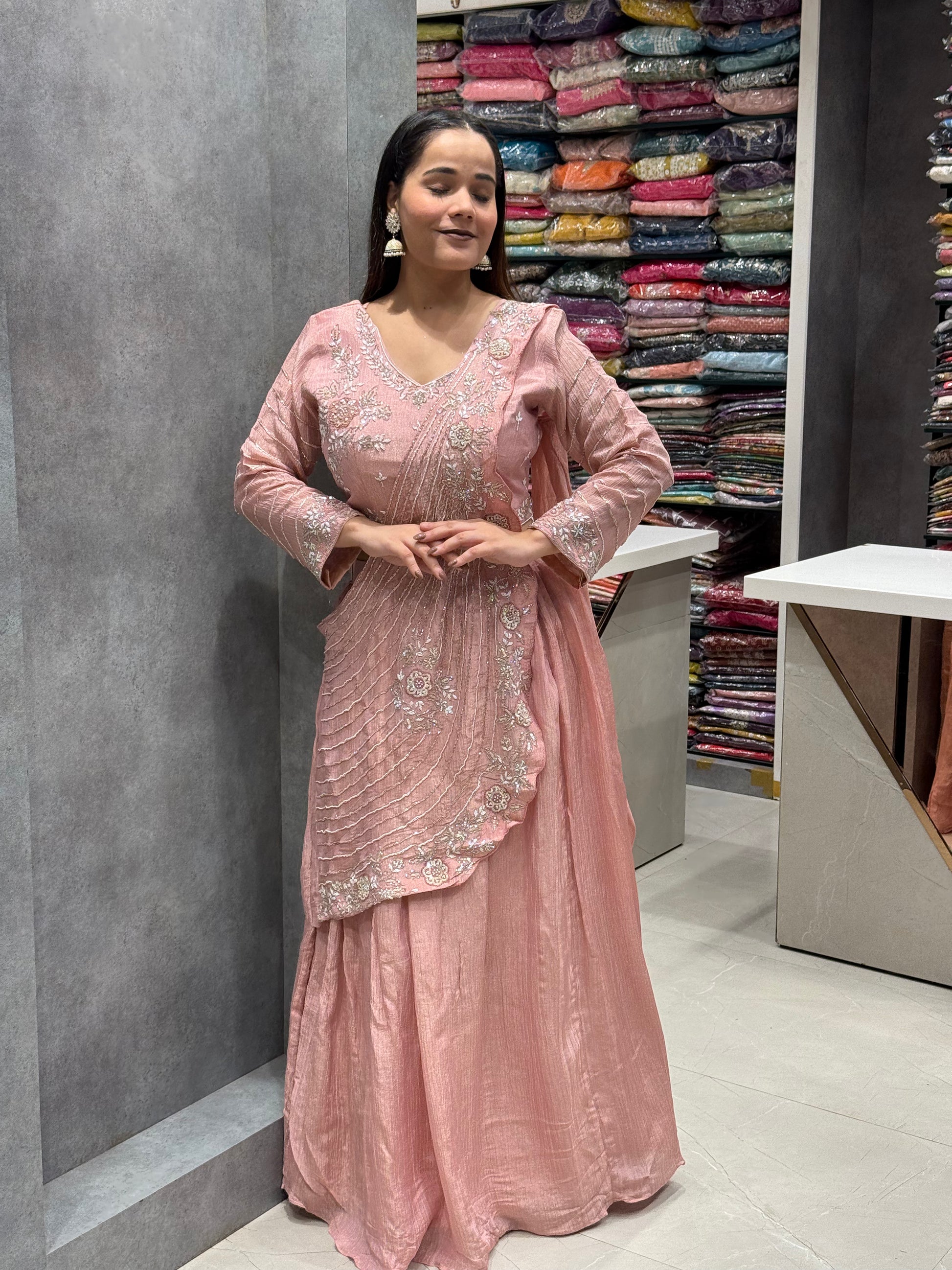 Step into effortless elegance with this dusty pink blouse and skirt set, exquisitely tailored in luxurious Dola Silk. Designed for the modern woman who loves traditional charm with a contemporary twist, this ensemble features an attached drape that beautifully mimics the look of a dupatta — without the hassle of carrying one.