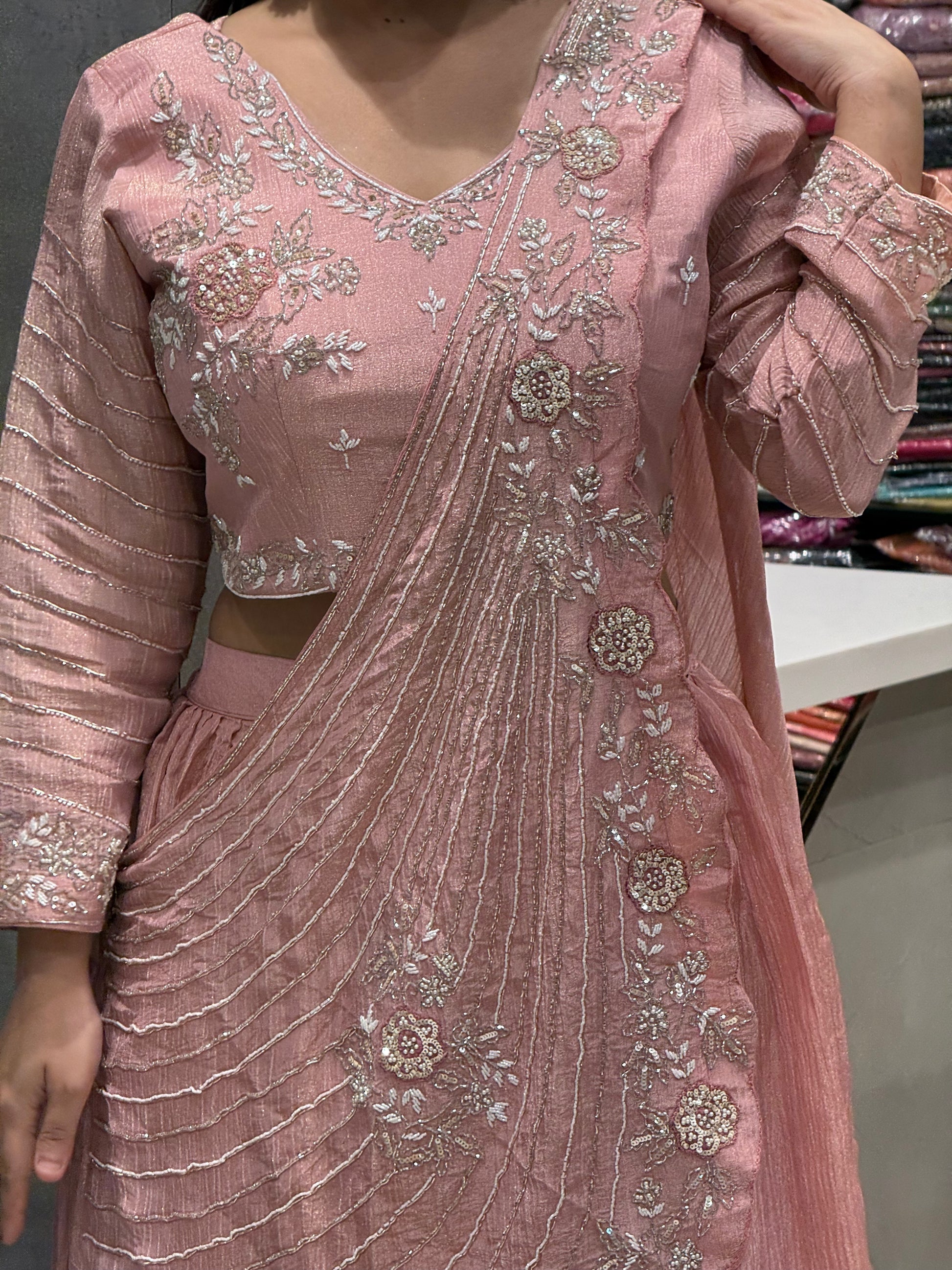 This coordinated set includes a fitted blouse with full sleeves and delicate embroidery, paired with a flowy silk skirt that flares gracefully with every step. The highlight is the attached pre-stitched drape cascading from the waistline, giving the outfit a saree-like elegance while keeping it modern and functional.