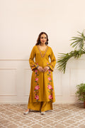 Crafted in a straight-cut, flowy silhouette, the kurta is adorned with vibrant pink floral motifs running down the front and on the bell sleeves, creating a striking contrast against the mustard base. Paired with wide-leg matching cotton pants, this set ensures both comfort and chic style.