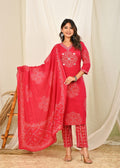 The kurta, pants, and dupatta carry coordinated Bandhani-style print work that creates a balanced and cohesive look while giving the attire a handcrafted ethnic charm.
