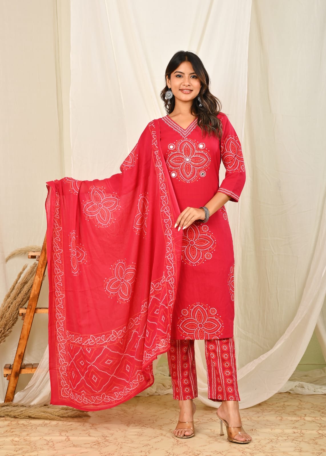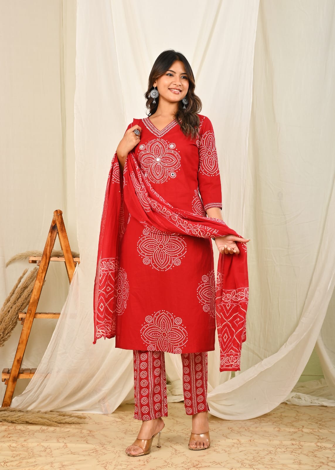 🌸 Why You’ll Love It: A timeless red cotton suit set with Bandhani-inspired design—lightweight, comfortable, and perfect for festive or casual elegance.
