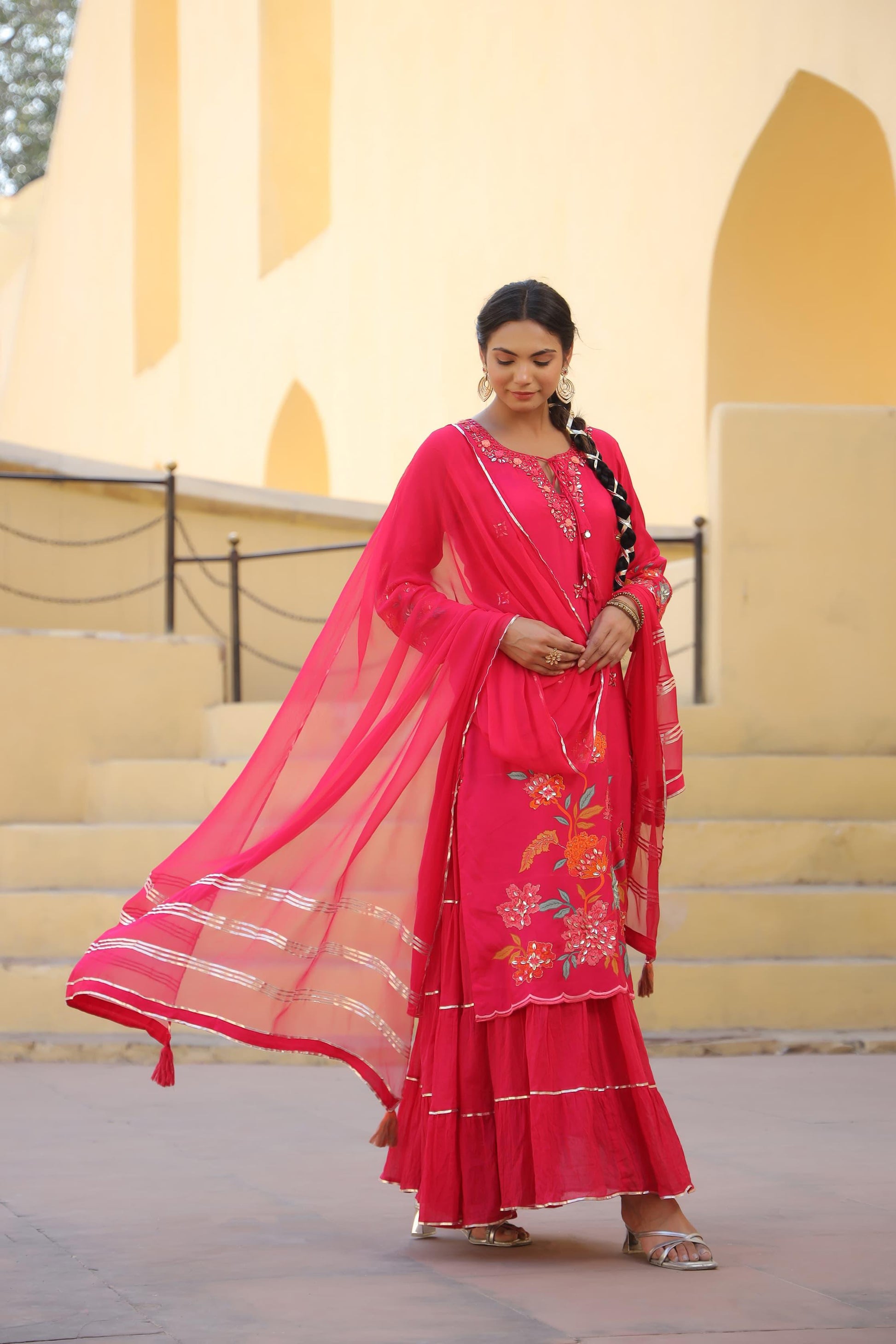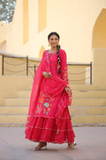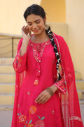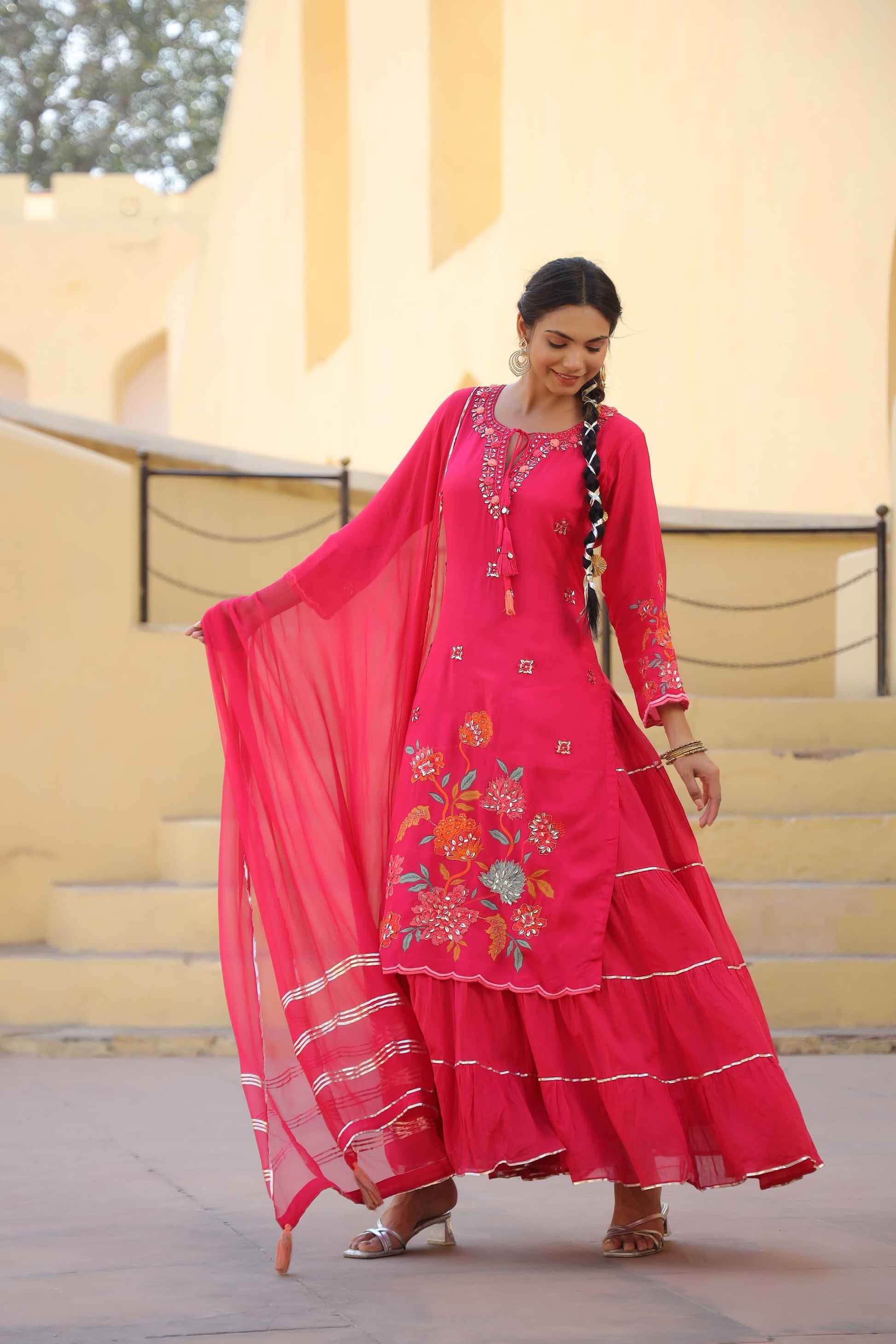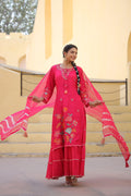 Add a touch of sophistication to your wardrobe with this stunning Muslin Silk Anarkali set. Crafted from premium-quality muslin silk, this ensemble combines luxurious comfort with graceful elegance. The rich fuchsia pink hue is beautifully complemented by intricate floral embroidery, adding vibrant charm to the attire.