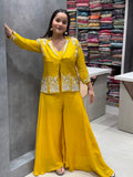 This chic three-piece set features a straight-cut embroidered jacket-style kurti, a matching inner camisole, and wide-legged palazzo pants. The silhouette is both flattering and comfortable, offering a relaxed yet tailored fit that drapes beautifully on all body types.