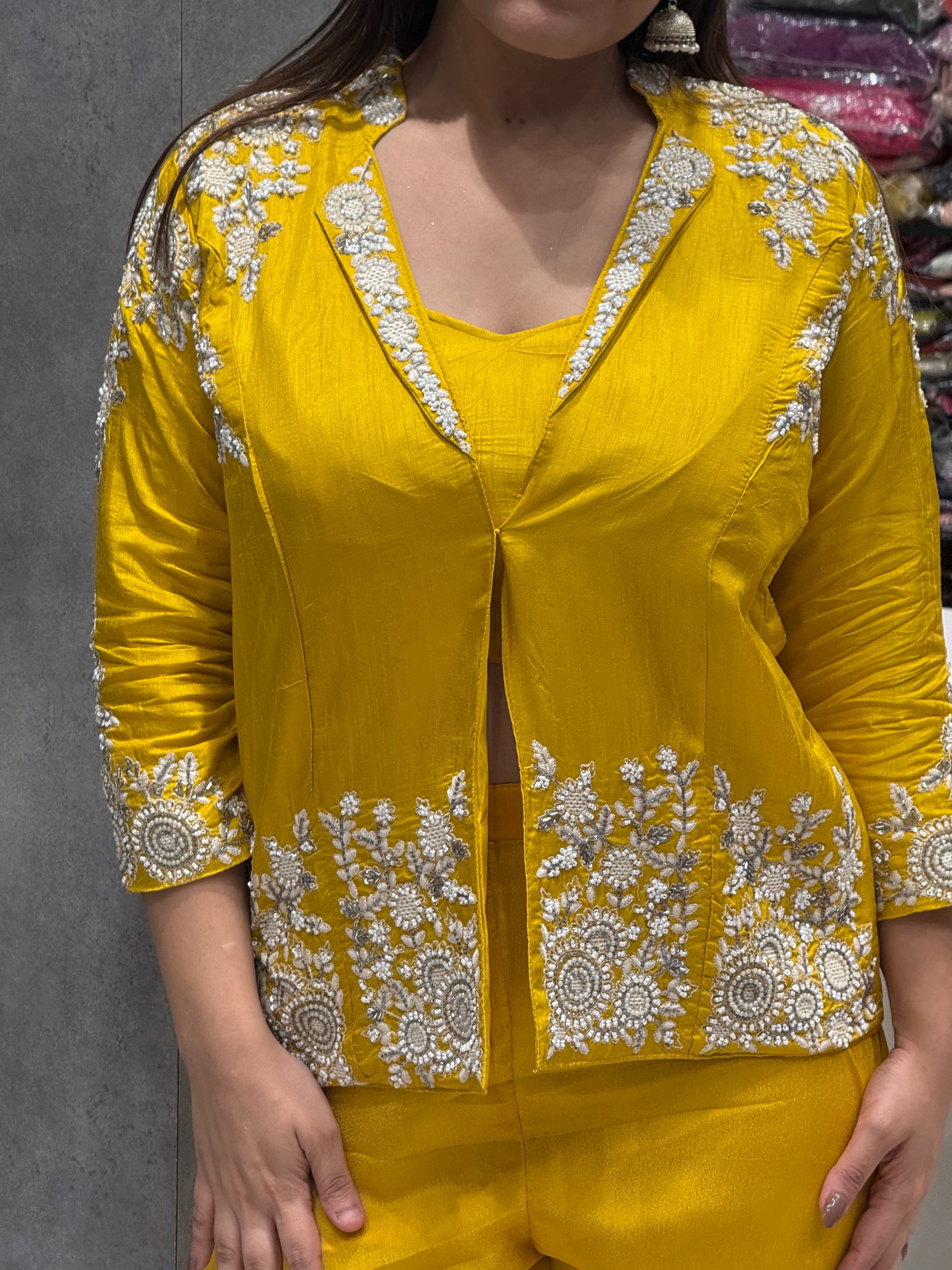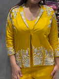 Elevate your ethnic wardrobe with this stunning mustard yellow co-ord set crafted in luxurious Dola Silk. Designed for the modern woman who loves a touch of tradition, this ensemble blends classic elegance with contemporary flair.