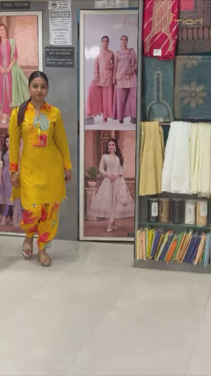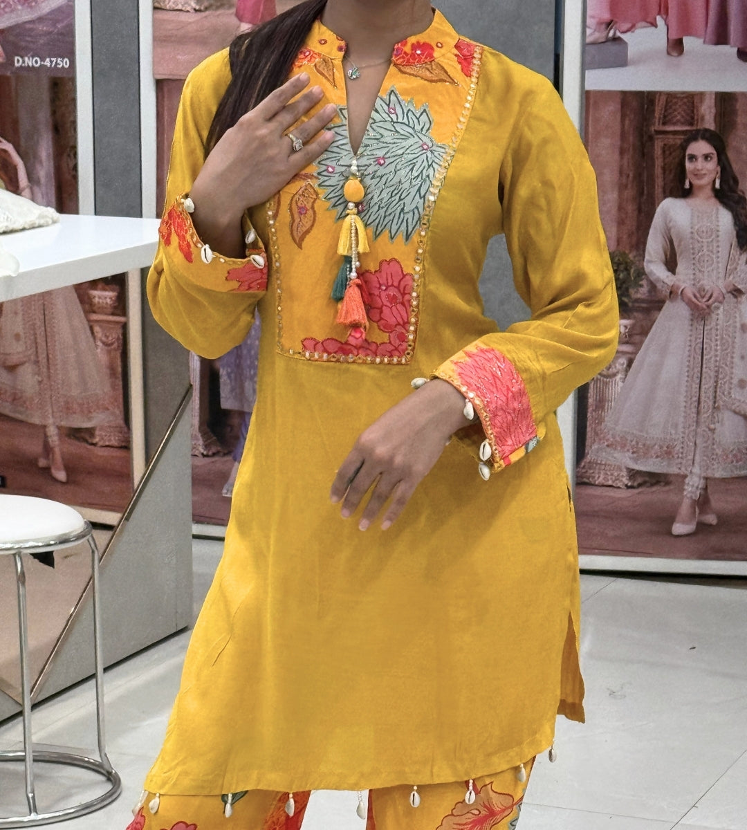 Turn heads with this bright and bold muslin silk suit set in a radiant yellow shade. The kurta is detailed with embroidered floral patchwork, mirror accents, tassels, and shell embellishments, adding a playful yet elegant charm. What sets this outfit apart is the different-style printed pants with floral motifs, giving it a trendy and modern edge.