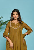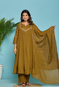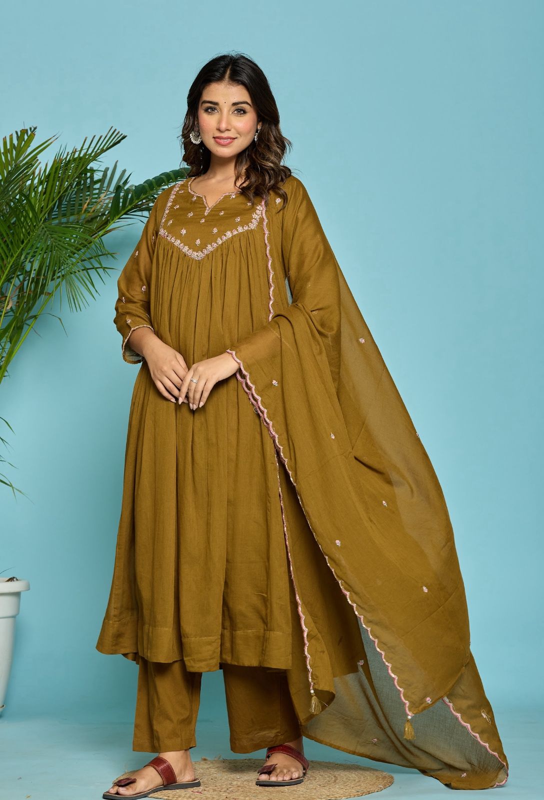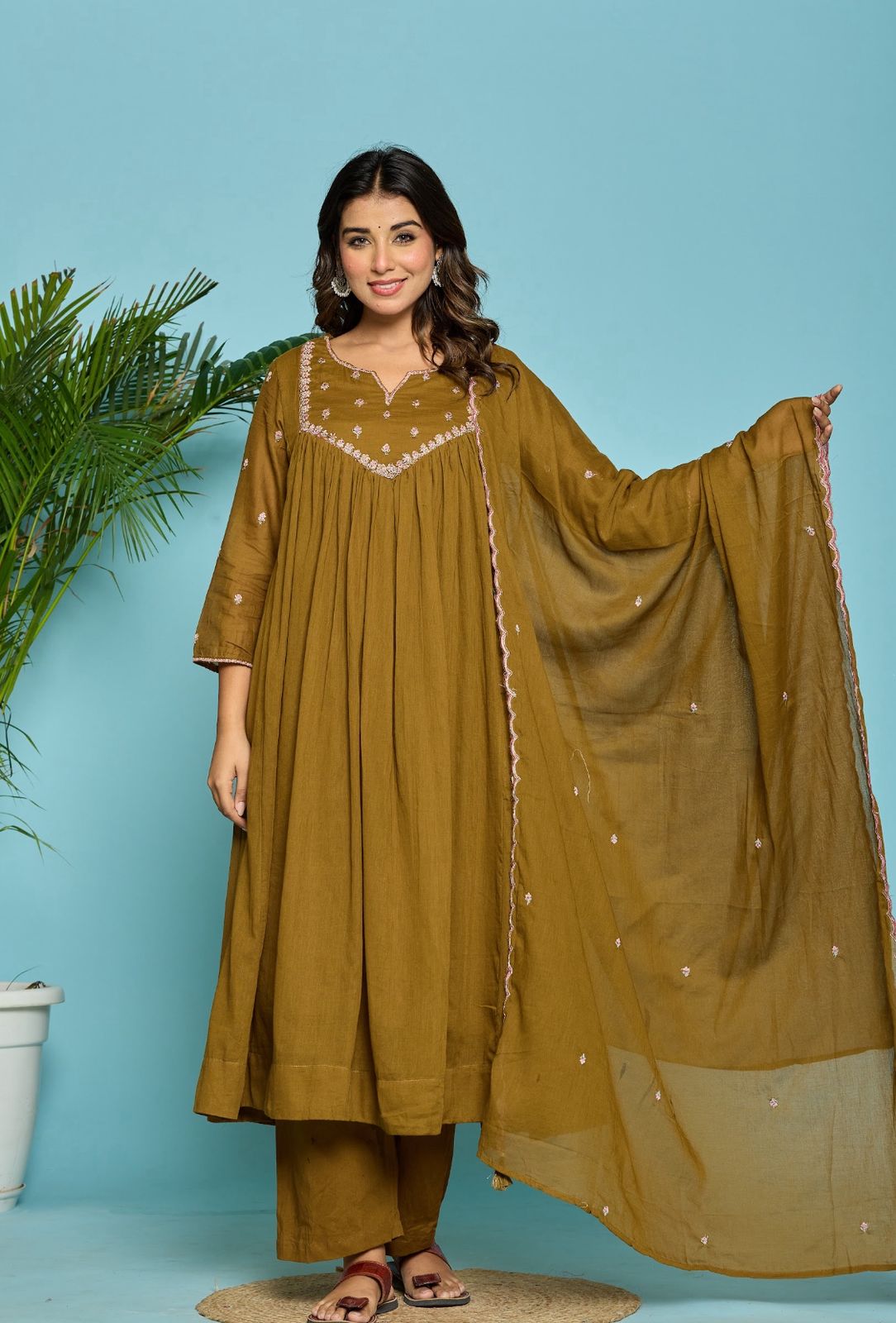 Step into effortless elegance with our beautifully crafted olive green kurta set in soft and breathable mul cotton fabric. Designed for comfort and grace, this outfit blends traditional embroidery with a flowy silhouette.