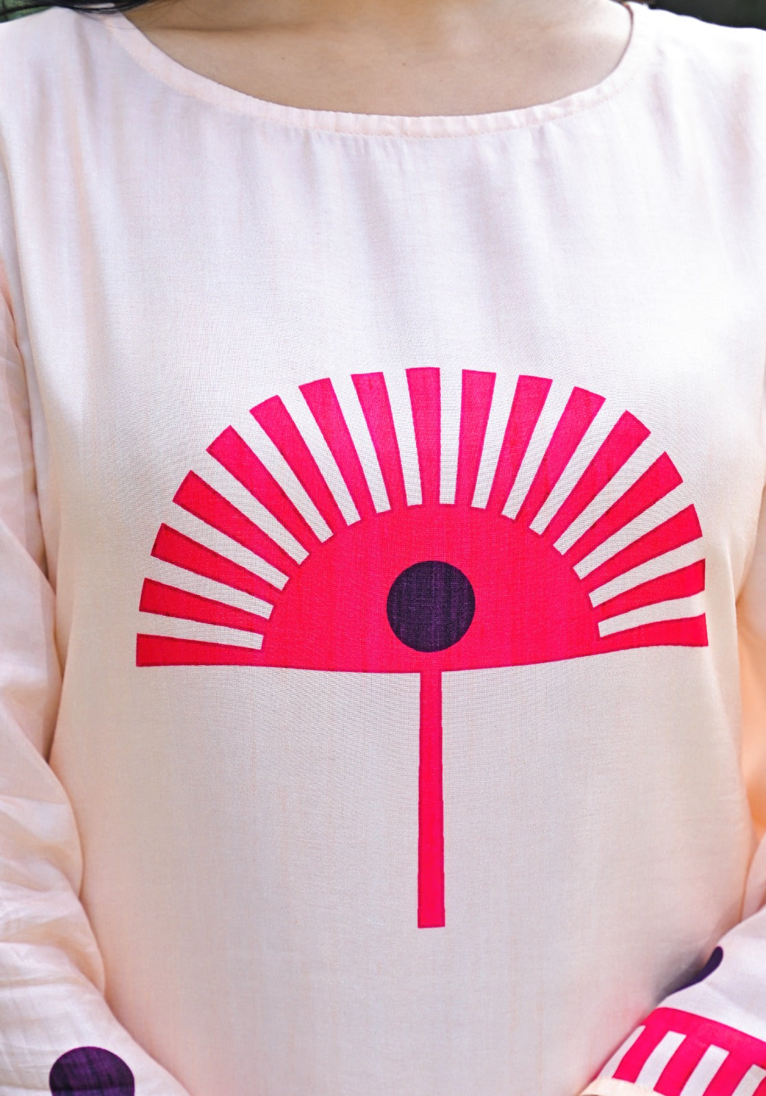 - Kurta: Straight-fit design with bold red geometric motifs, round neckline, and stylish 3/4th sleeves