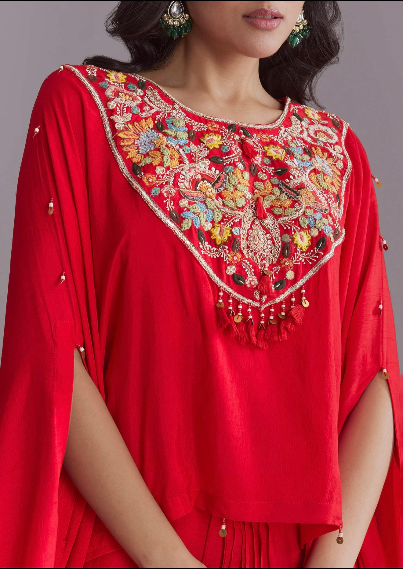 The cape-style top features a striking hand-embroidered neckline with vibrant resham, zari, and mirror accents, creating a rich play of texture and color. Its asymmetric drape sleeves adorned with delicate bead tassels exude contemporary elegance, while the fluid straight-fit pants complete the look with ease and sophistication.