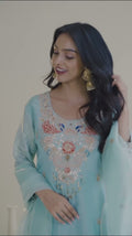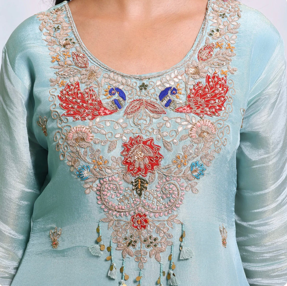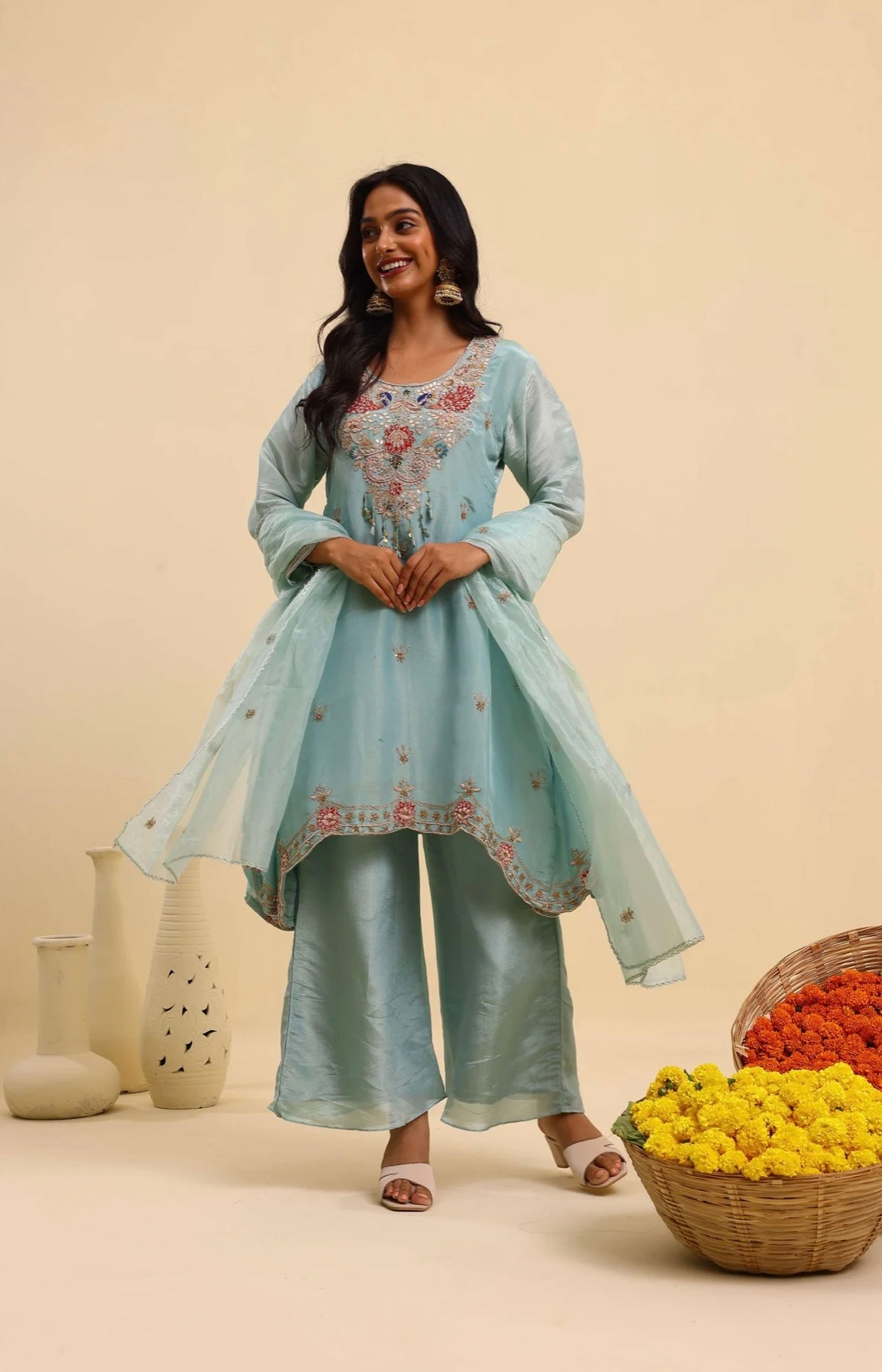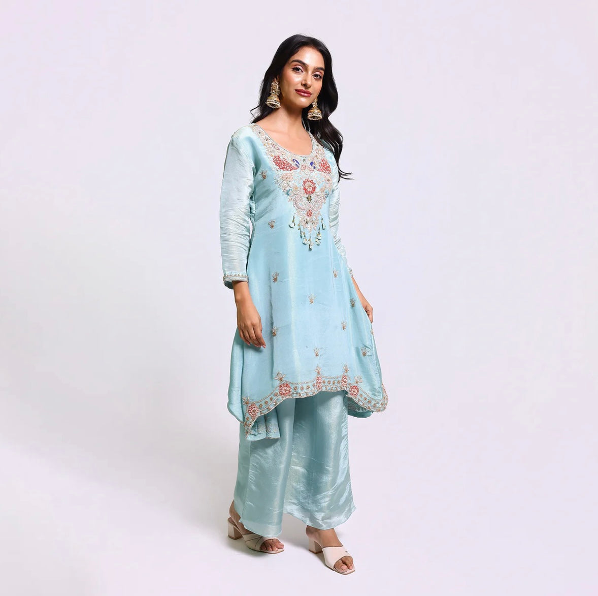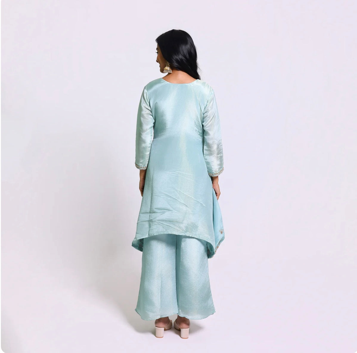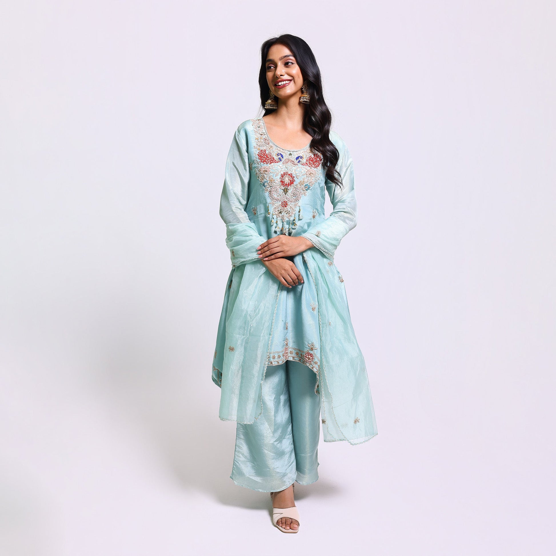 Radiate poise and sophistication with this Aqua Elegance A-Line Silk Kurta Set, crafted to bring out your effortless charm. Designed in a calming aqua hue, this ensemble is perfect for festive gatherings, weddings, or intimate celebrations.