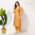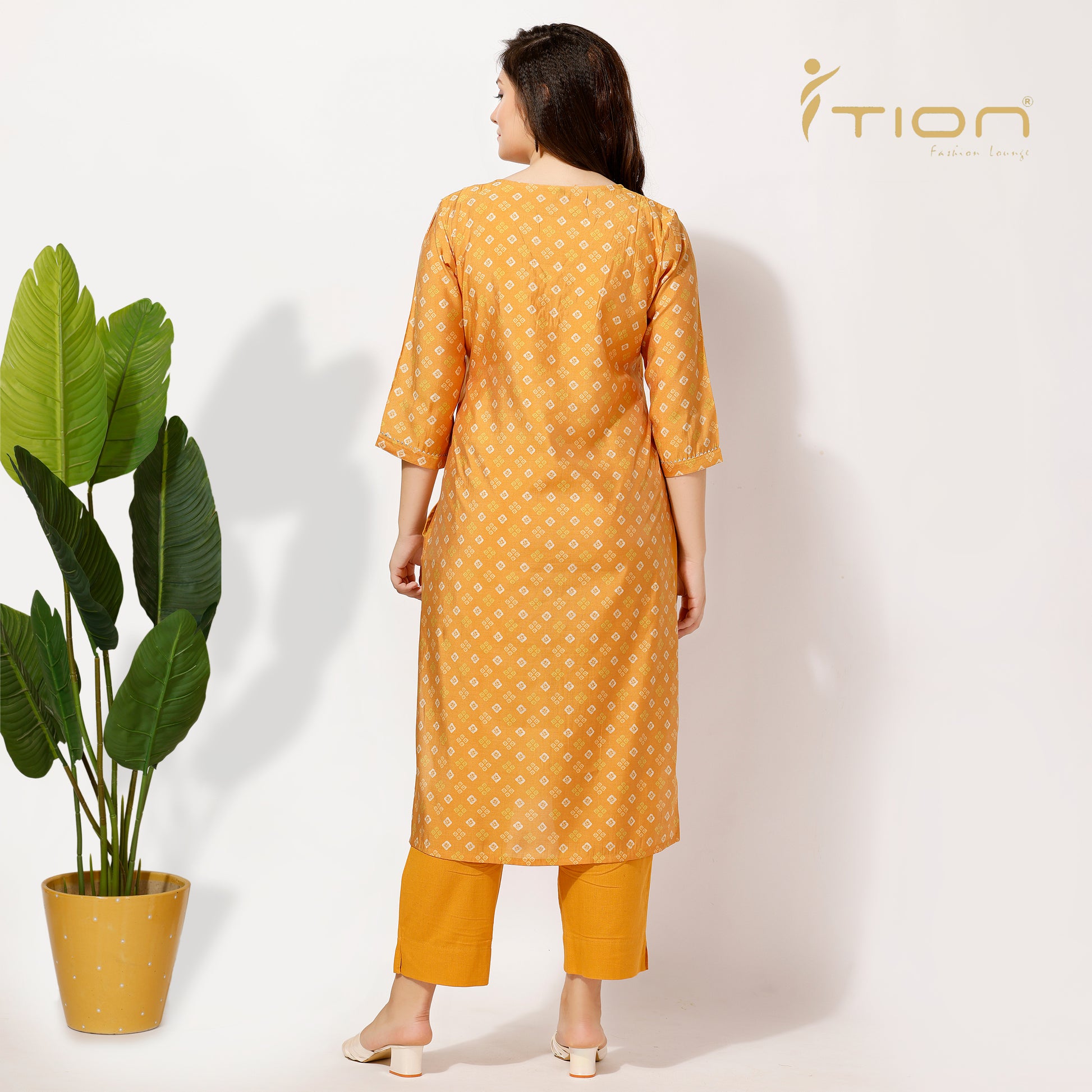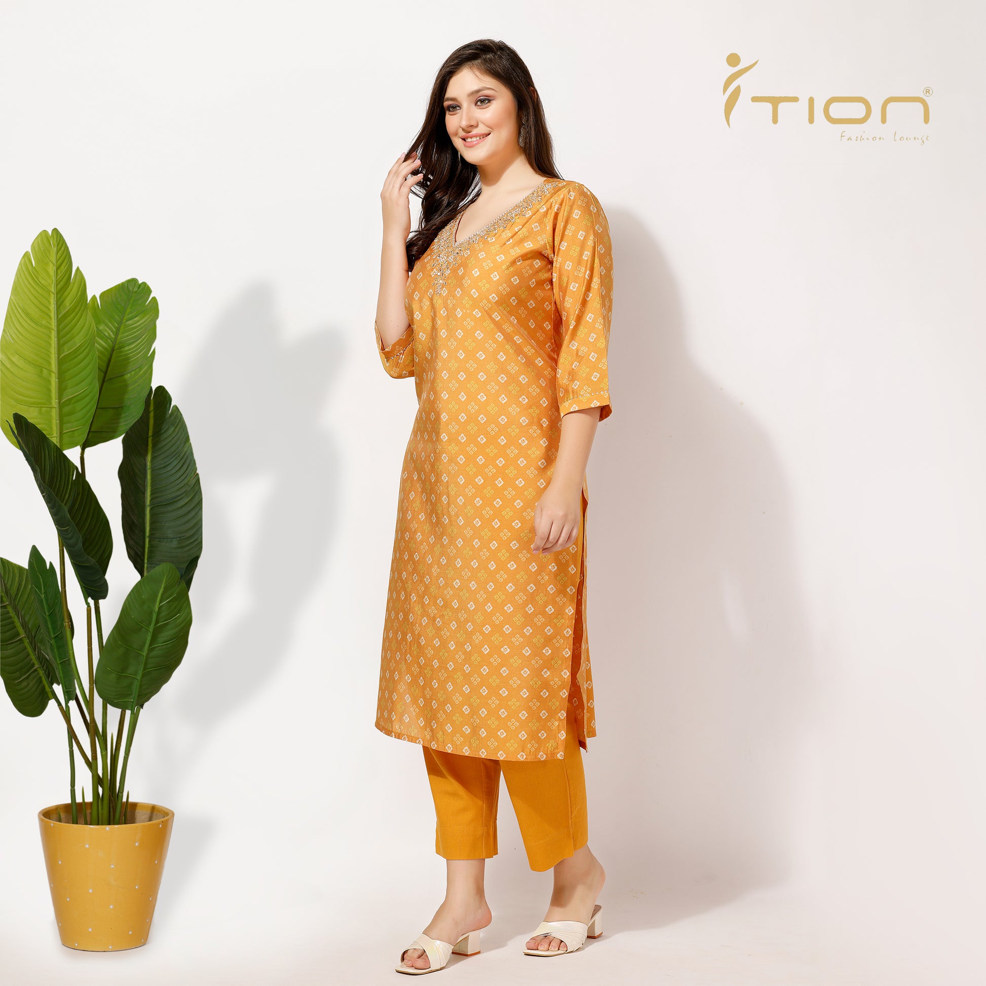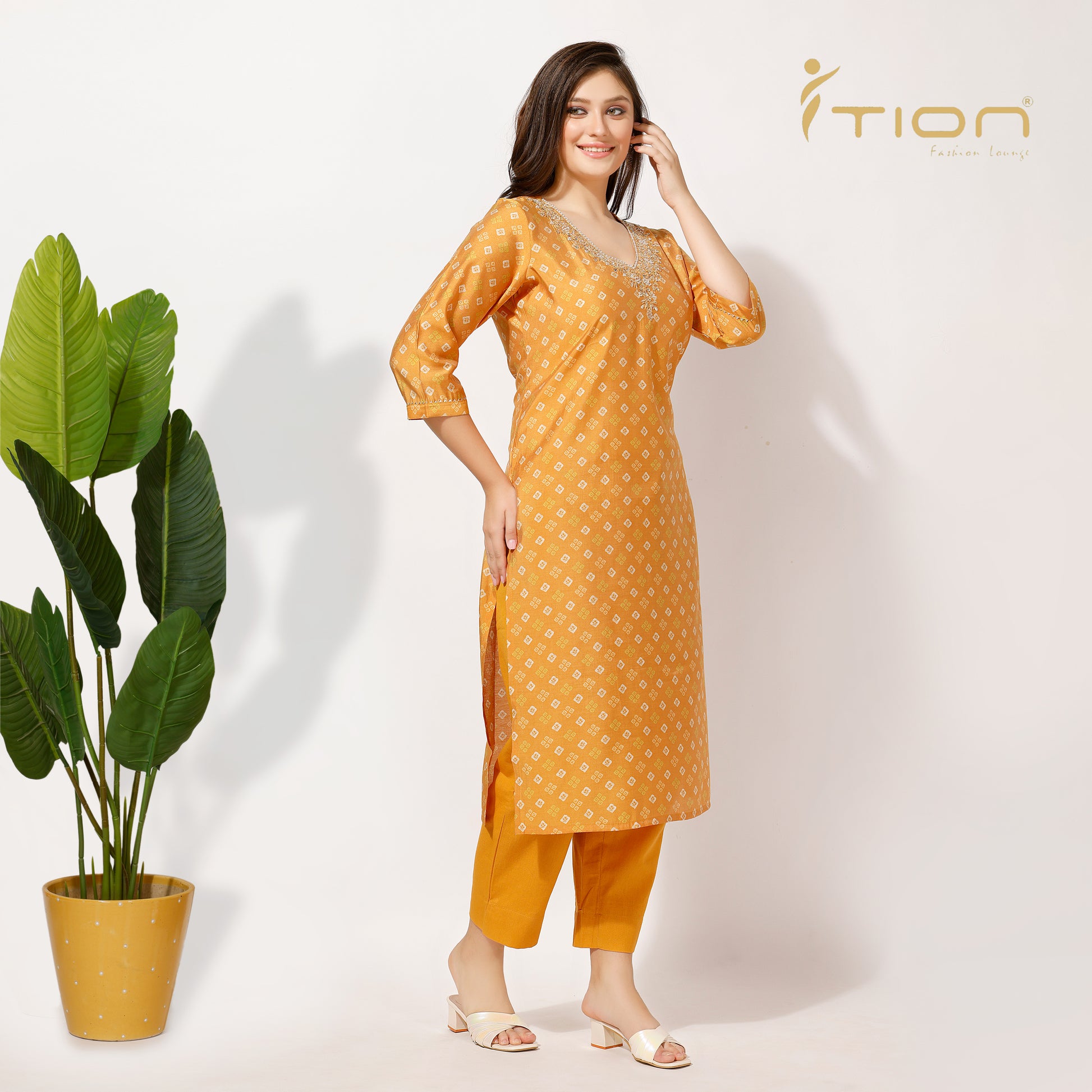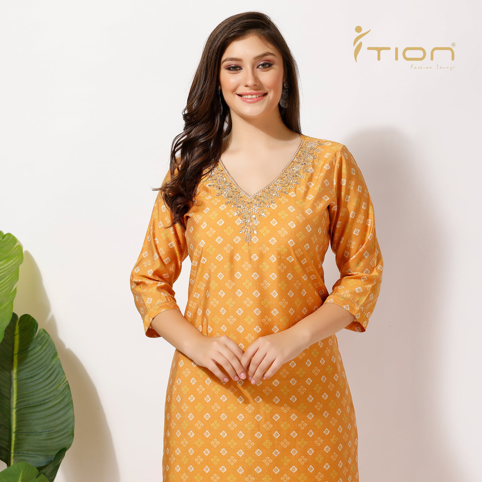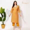 "Follow tradition with our Bandhani Kurti Set. The expensive muslin silk has been used to create this set, with an all-over V-neckline embroidered to give it a touch of royalty. It comes along with comfortable cotton pants, combing elegance and ease in just one outfit, apt for all special events and festivals.